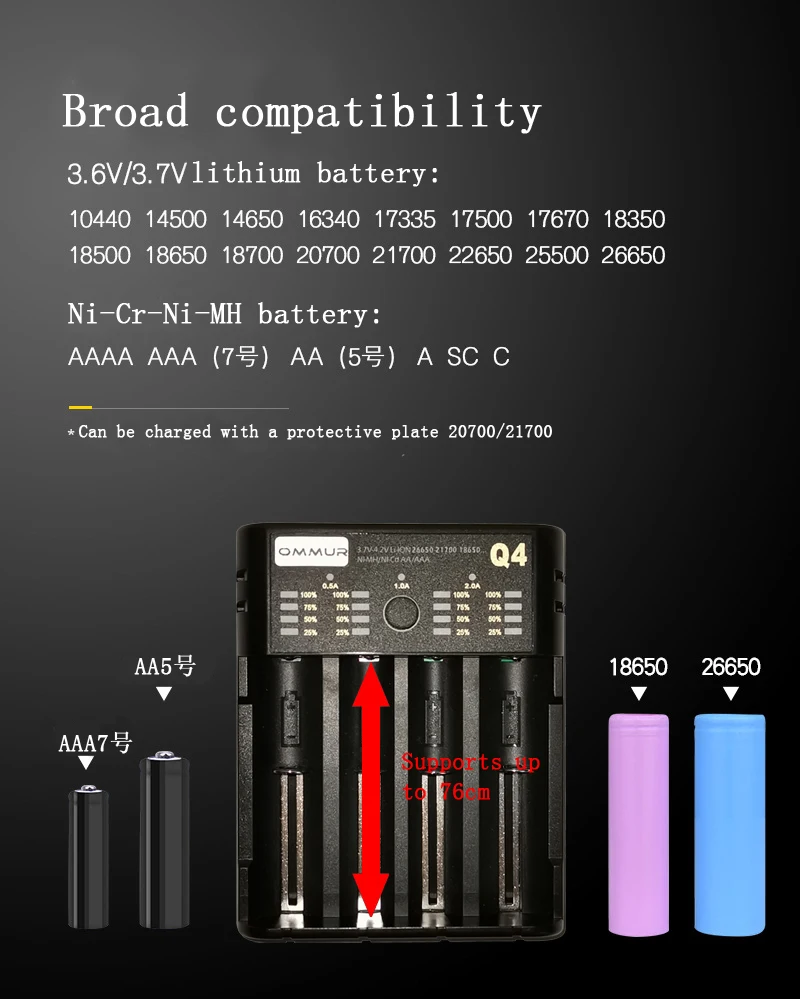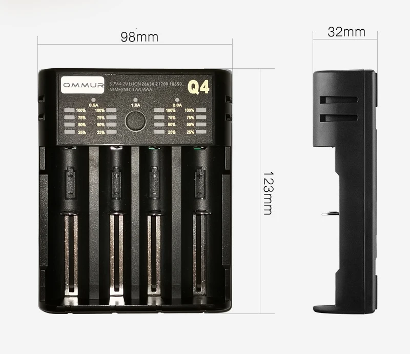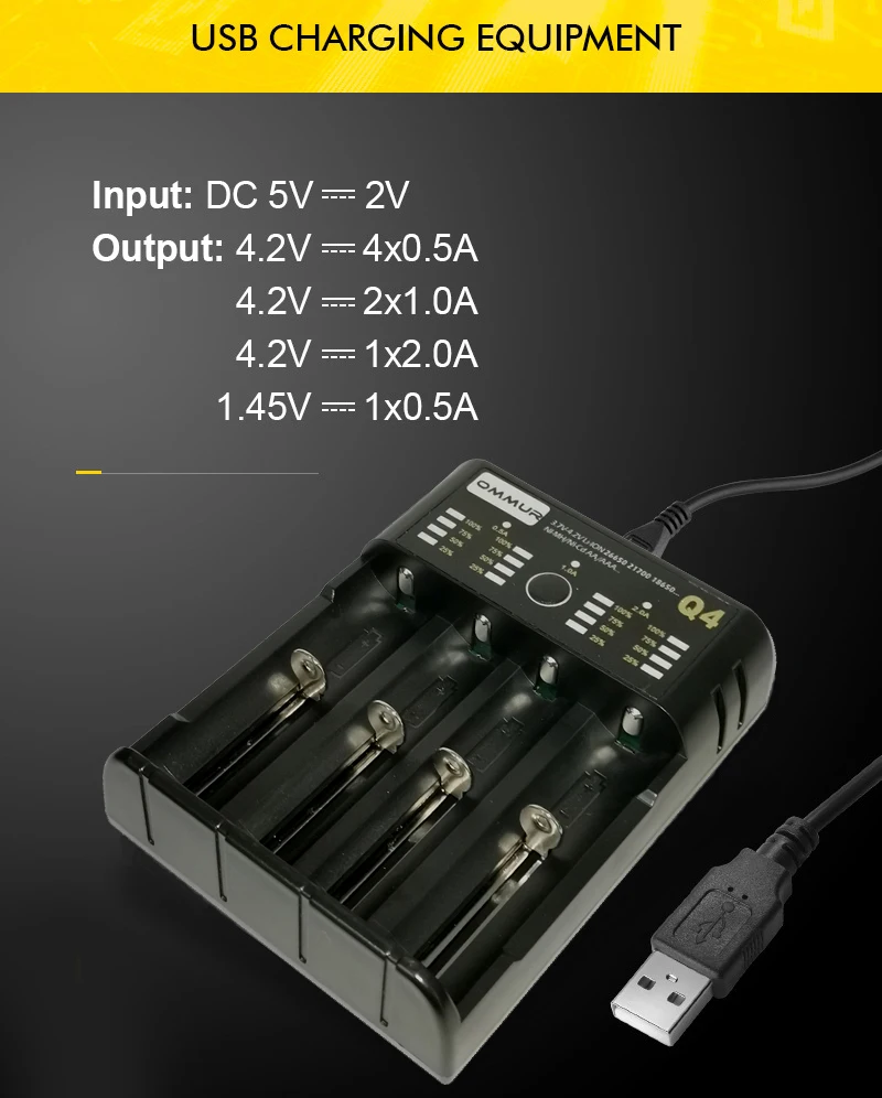 Многофункциональное умное зарядное устройство с usb-интерфейсом Модель: OMMUR-Q1 Q2 Q4 Аксессуары: зарядное устройство, USB-кабель Импорт: 5V2A Выход: 4.2V 2A/4.2V 1A/4.2V0.5A/1.45V0.5A Применимый аккумулятор: 3,6 V, 3,7 V-4,2 литий-ионный аккумулятор: 10400/14500/14650/16340(RCR123)/18350/18500/18490/18650/20700/21700/22650/26650/26700 1,2 V-1,4 V Ni-mh/Ni-CD батареи: класс аааа/AAA/зарядное устройство для никель-кадмиевых или никель-металл-SC/C/F6