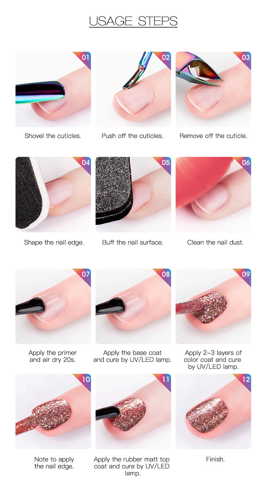 -1. Shape the nail. Lightly buff the surface of the nail plate. Sanitize. -2. Apply a base coat of foundation from the cuticle to the free edge (Remember to seal the edge of the nail). Cure the nails under the LED light for 10 seconds or a UV light for 2 minutes. -3. Apply a thin coat of Soak-Off Gel Polish color of choice. Cap free edge. Cure: 30 seconds in LED Lamp, or 2 minutes in UV lamp. -4. Repeat the 2nd thin coat of the soak off Gel Polish to the nails. Cure under the LED lamp for 30 seconds or a UV light for 2 minutes. -5. Apply a top coat. Cap free edge. Cure:30 seconds in LED lamp. -6. Remove the tacky residue on nails with the cleanser. Then, apply nourish cuticle oil to rehydrate moisture into the cuticle and the skin surrounding the nail.