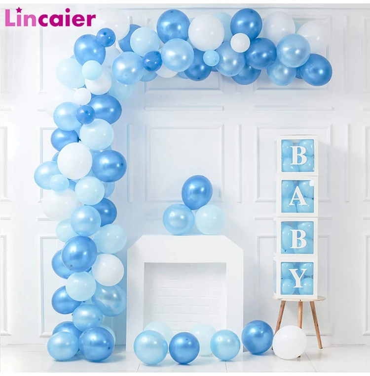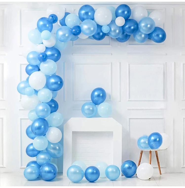 Набор содержит: 25 шт 12 дюймов прозрачные перламутровые латексные шары, 25 шт 12 дюймов синие перламутровые латексные шары, 25 шт 12 дюймов светло-голубые перламутровые латексные шары, 25 шт 10 дюймов светло-голубые макароны, 10 шт. 5 дюймов прозрачные перламутровые латексные шары, 10 шт. 5 дюймов синие перламутровые латексные шары, 10 шт. 5 дюймов светло-голубые перламутровые латексные шары, 2 шт. 100 точечный клей, 1 шт. 5 м (16 футов) прозрачная цепочка для воздушных шаров.