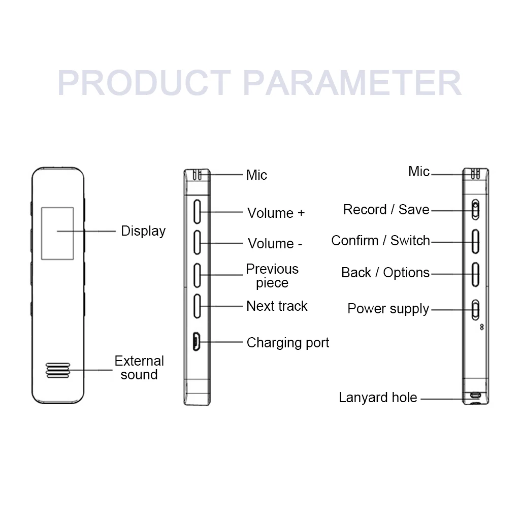 -Запись с голосовым управлением: запись со звуком, автоматическая пауза без звука, эффективное сохранение пространства памяти, фильтрация недействительных зажимов и сокращение времени воспроизведения. -Запланированная запись: Автоматическое включение записи в соответствии с заданным временем, поэтому вам не придется беспокоиться о пропущенных важных записях. -Непрерывная запись, поддержка записи во время зарядки. Подключенный к источнику питания может записывать во время зарядки, решать традиционную запись, отсутствие нехватки энергии, беззаботный Срок службы батареи. -Защита паролем: только ваш собственный диктофон, поддерживает настройки паролей во время загрузки, защищает аудиоматериалы, а содержимое не просочивается. -Воспроизведение без потерь MP3: Поддержка WAV, APE, FLAC, MP3 и других форматов. -Функция передачи OTG: Поддержка двусторонней передачи OTG, более удобная в использовании.