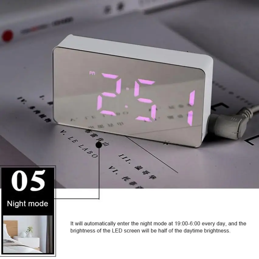1. Светодиодный индикатор времени, даты и температуры; 2,2 яркости дисплея 3. Календарь: 1 января 2000 года-31 декабря 2099 года 4. Три набора функций будильника 5. Диапазон температур: -9 ° C -50 ° C 7. Функция зеркального отображения 8. Настройка режима (18:00-06:00)