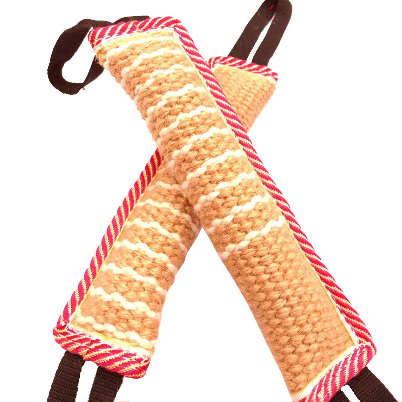 Высокое качество: высококачественная и прочная игрушка с двойной строчкой и жесткой кусательной поверхностью рукава из джута. 2 ручки для удобного и легкого захвата, полного контроля и стабильности.