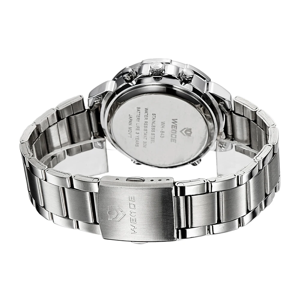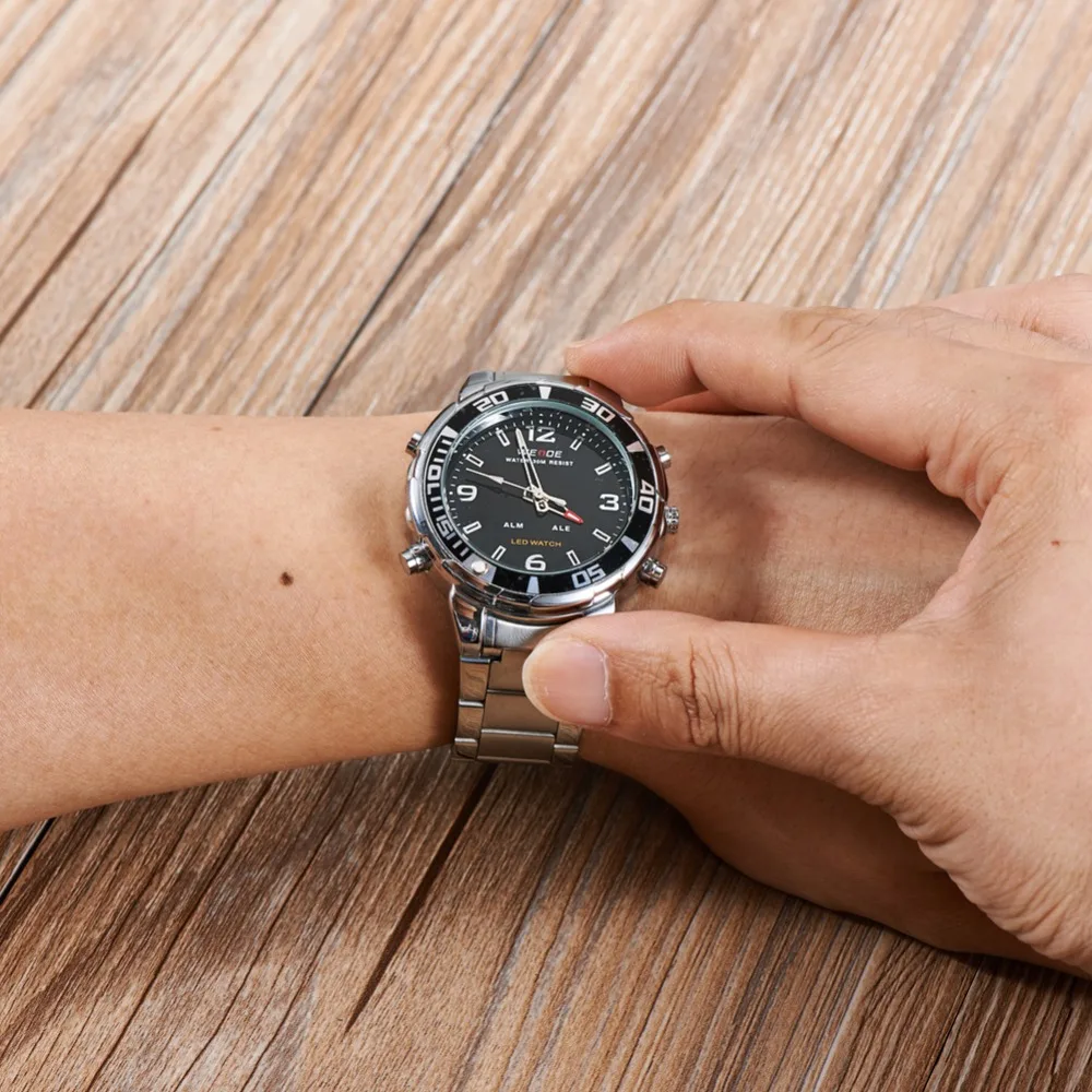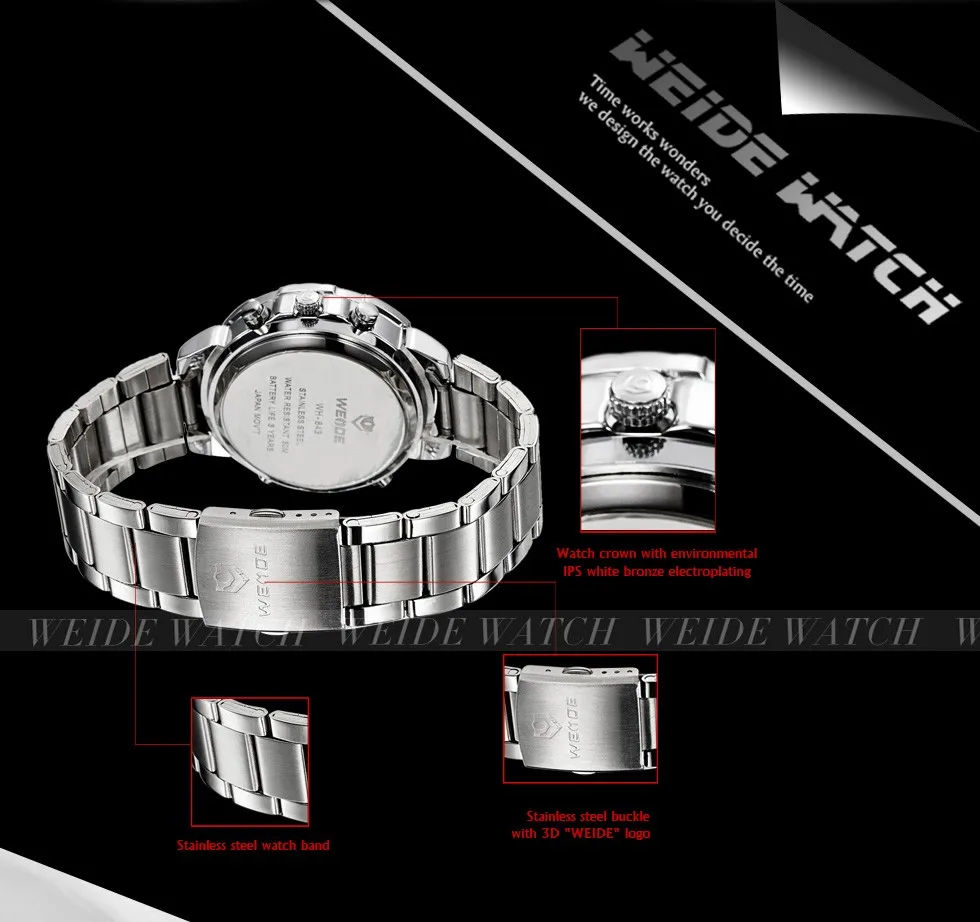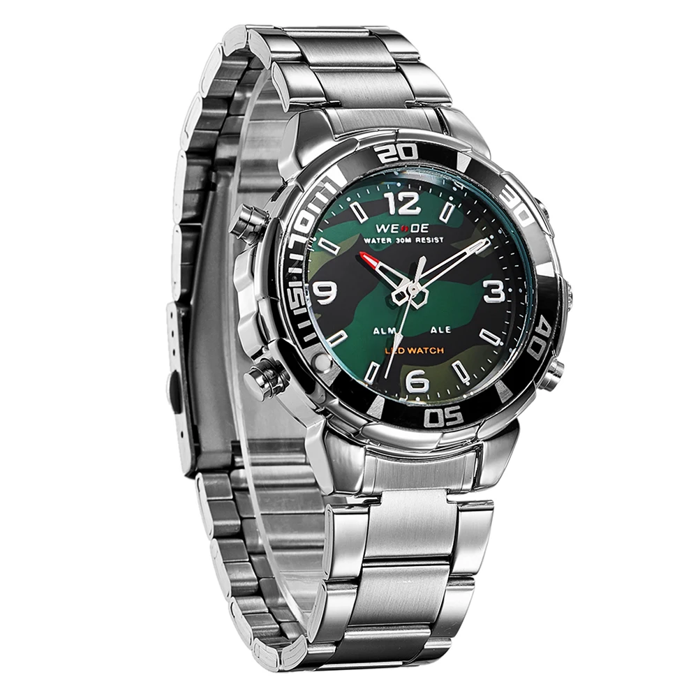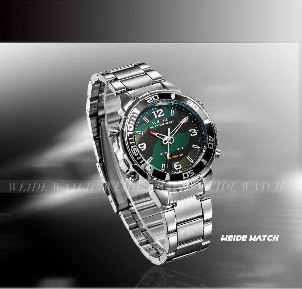 Бренд: WEIDE Артикул: WH843 Стиль: спортивный, Повседневный, деловой, уличный Дисплей: ANALOG-LED цифровой Механизм: оригинальный японский кварц + светодиодный цифровой механизм Особенности: -Все Спортивные часы WEIDE(WH843), аналого-цифровой светодиодный дисплей, доступны в 4 вариантах; -Передовая технология производства; -Экологичный чехол с гальваническим покрытием IPS; -Погрешность в ходьбе ± 45 шт./м -Рабочая температура: от-10 °C до + 50 °C; -Оригинальный японский модуль времени, кварцевый механизм -Черно-темно-синие Безель чехол-это точка данной модели -Заводная головка с экологичным бронзовым гальваническим покрытием IPS; -Циферблат часов с Hi-tech, светодиодный, photopermeable; -Настоящая нержавеющая сталь задний Чехол с лазерным логотипом, нанесенным по передовой технологии; -Время, секунда, месяц, дата, неделя и функция будильника; -Отображение времени в двух местах; -Четыре кнопки для управления различными функциями; -Водонепроницаемость до 30 метров (пожалуйста, не нажимайте кнопки под водой); -Материал ремешка: нержавеющая сталь -Застежка: раскладная застежка-с Безопасность Параметры: Чехол Диаметр: 4,16 см Чехол Толщина: 1,52 см Длина ремешка: 20 см Группа Ширина: 1,5 см Компоненты включает в себя: 1x Спортивные Наручные Часы 1x Инструкция 1x подарочная коробка