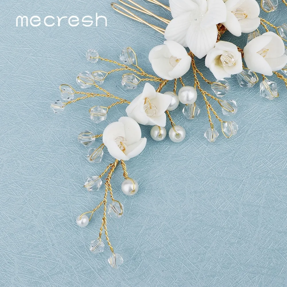 Mecresh White Flower Beads Wedding Hair Accessories Hair Comb Gold Color Handmade Women Bridal Headpiece Hair Ornaments FS334 Brand: Mecresh