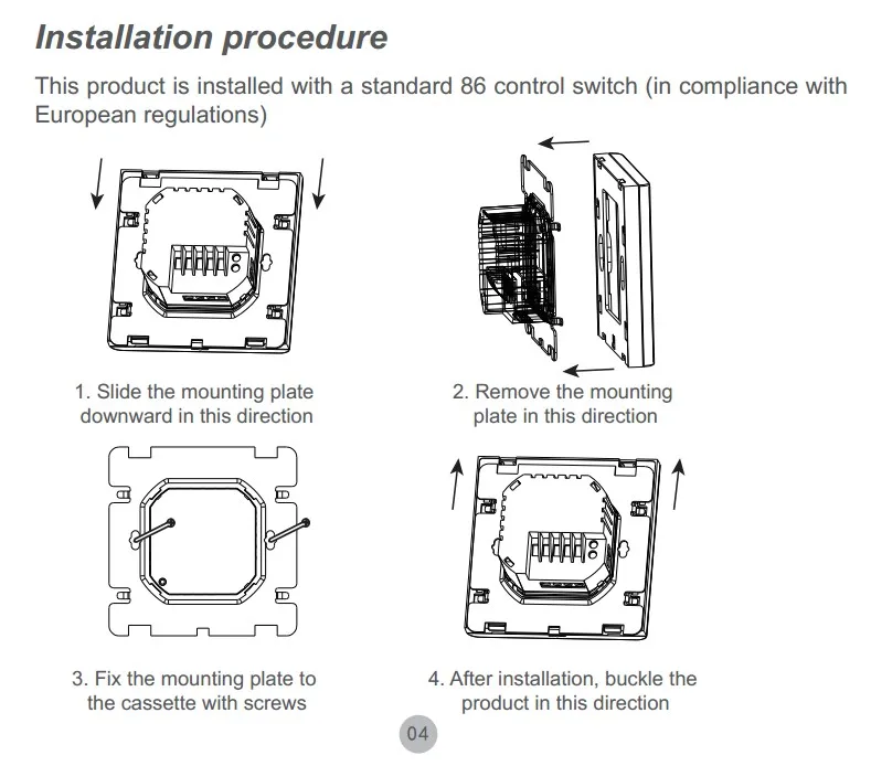 Источник питания: 95 ~ 240 В переменного тока, 50 ~ 60 Гц -Ток нагрузки: 16 А -Цвет: белый, черный (опционально) -Дисплей: ЖК, сенсорный экран -Точность отображения: ± 1 ℃ -Датчик: NTC -Диапазон температур: 5 ~ 60 ℃ (макс. 70 ℃) -Температура окружающей среды: 0 ~ 95 ℃ -Расход энергии: <1 Вт -Программа работы: Установите на 1 неделю в качестве цикла (5 + 2 или 6 + 1 или 7) -Монтажная коробка: 86*86 мм квадратная или европейская круглая коробка 60 мм -Клеммы для проводов: провод 2*1,5 мм2 или 1*2,5 мм2 -Размеры: 86*86*40 мм/3,4*3,4*1,6 в -Класс защиты: IP20 -Материал корпуса: поликарбонат, АБС-пластик (огнестойкий)