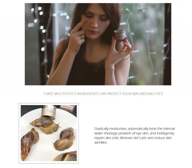 Содержит фильтрат секреции улитки, который увлажняет и увлажняет, может облегчить внутреннее обезвоживание кожи вокруг глаз, восстанавливает клетки кожи, удаляет старый кератин и уменьшает морщины на коже.