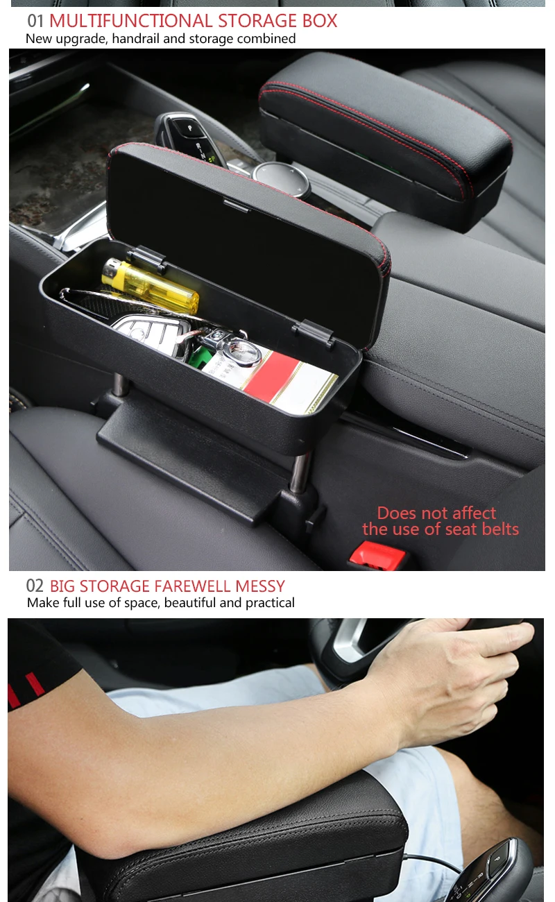 Название продукта: ящик для хранения в подлокотнике автомобиля цвет коробки: полный черный/черный красный/серый/бежевый Размер коробки: около 23,5x8x8,5 см Максимальная высота: 40 см. Материал: высококачественная искусственная кожа Вес: около 0,97 кг/компл. Модель: Универсальная посадка для всех автомобилей. Размещение: Может использоваться на водительской и пассажирской стороне. Особенность: 1. 100% новое поступление бренда. Высококачественная накладка из искусственной кожи и стойка из нержавеющей стали. 2. Регулируемые и простые в установке, не влияют на регулировку сидений, снимают усталость от движения на дальние расстояния и безопасно ездят. 3. Дополнительное хранилище для ваших вещей, таких как смартфон, кошелек, сигарета, ключи, монеты, кредитные карты, ручки, солнцезащитные очки и т. д. легко достать его во время вождения. 4. Совместим с большинством видов автомобилей. Просто вставьте ящик для хранения в сиденье и консоль для легкой установки. Упаковка: 2 комплекта/1 комплект/заказ