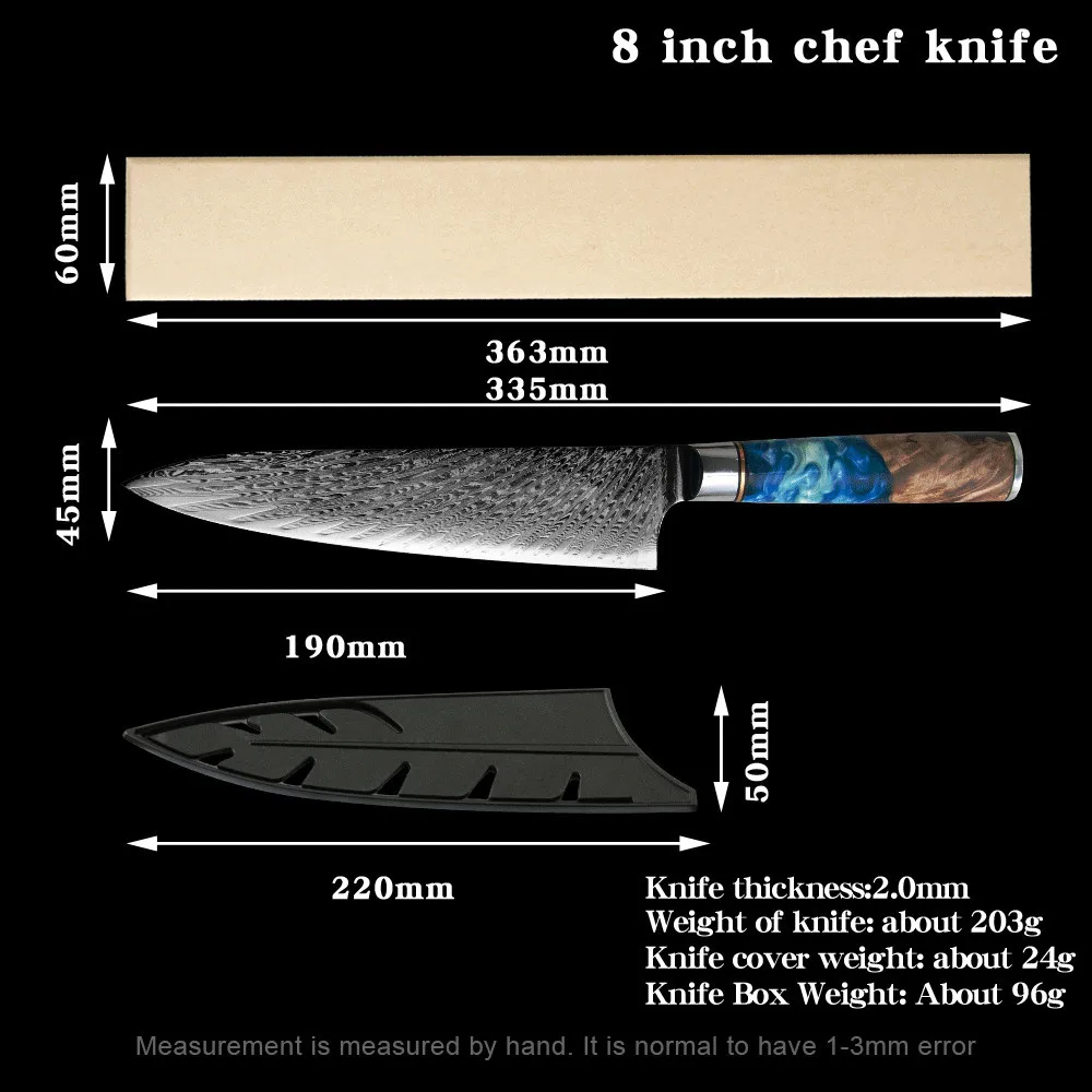Супер острое лезвие искусно изготовлено из 67 слоев VG-10 японской высокоуглеродистой нержавеющей стали обеспечивает исключительную прочность, долговечность и устойчивость к пятнам. V-Glod 10 японский супер стальной режущий сердечник с твердостью 62 + Rockwell. Кухонный нож, изготовленный с VG10, имеет лучшую прочность на края, удержание, остроту.