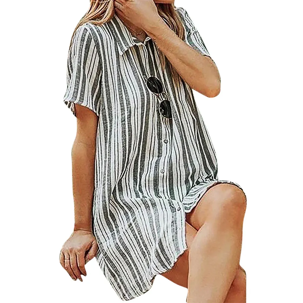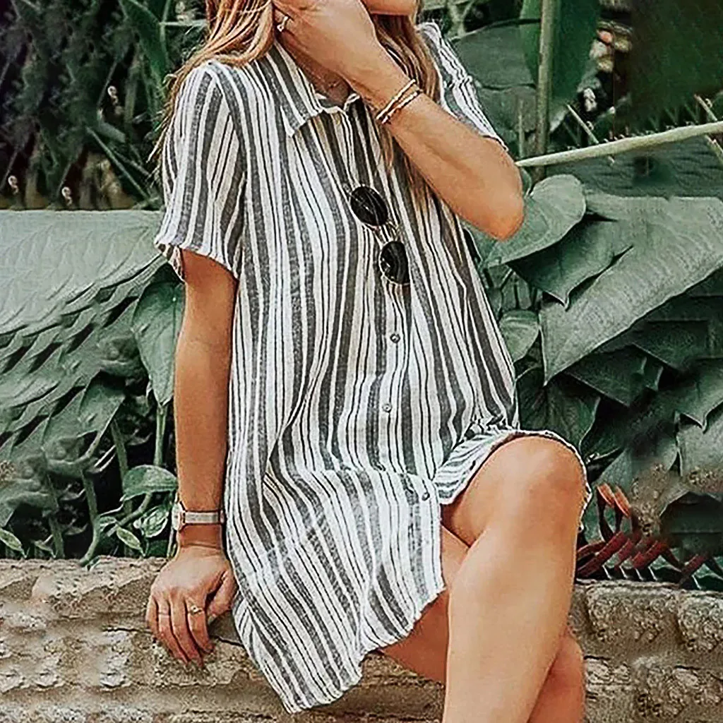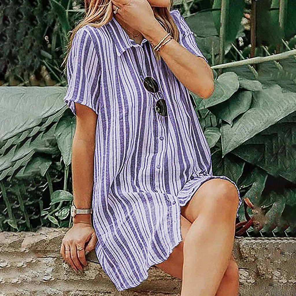 Fashion Women Lapel Stripe Printing Short Sleeve Easy Sandy Beach Mini Dress