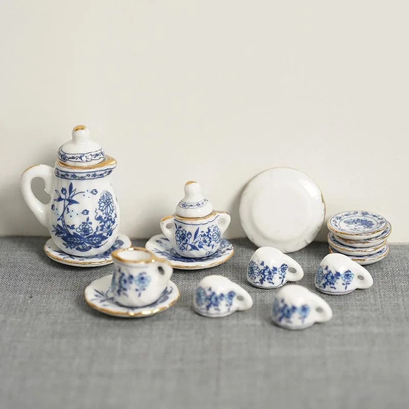 15 шт./компл. кукольный домик Миниатюрный синий и белый набор керамический имитационный горшок чашки набор моделей игрушечный кукольный домик аксессуары
