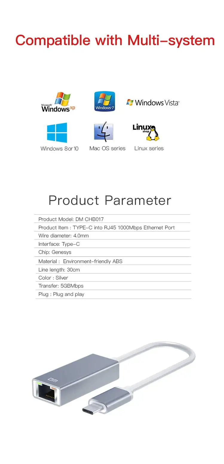 Product Item: CHB017 Features: TYPE-C interface hub with RJ45 1000Mbps Ethernet Port no need driver support MAC and windows Material: Zink Alloy+ABS Net Weight: 26g Product Size: L60.5*W24*H16.5mmTYPE-C to 1000mbps ethernet port, with aluminum alloy housing, no need driver, support MAC and windows, with gift box packing