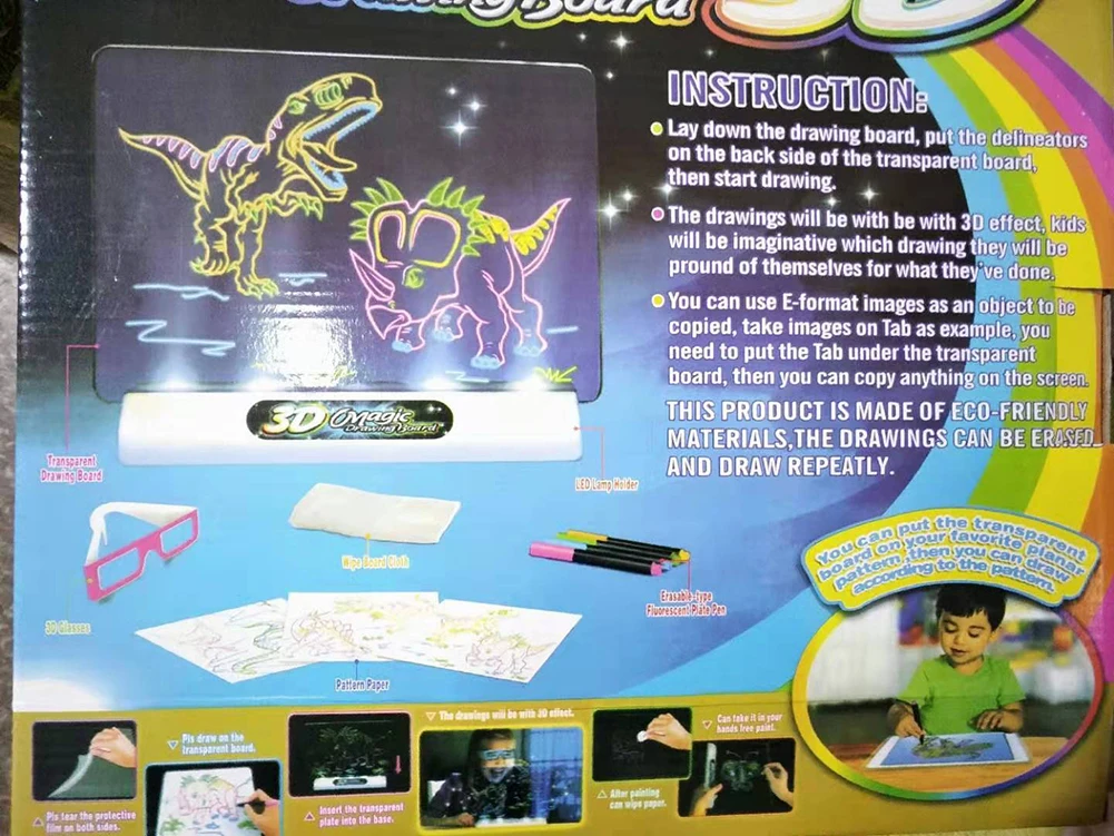 4 неоновых ручки 3 x двухсторонние фотографии 1 x 3D очки 1 x прозрачная доска для рисования 1 x держатель светодиодной лампы 1 x лист для протирания