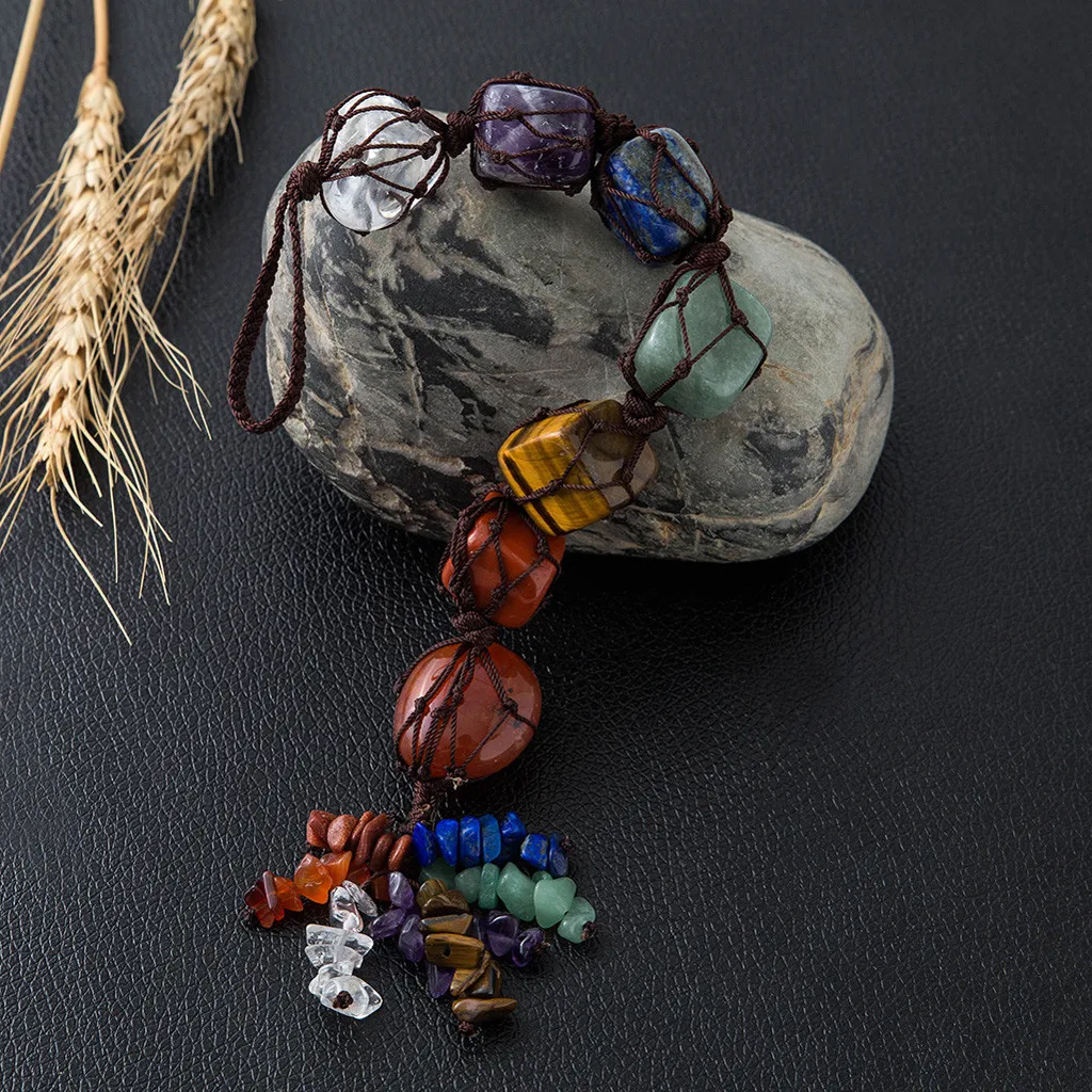 7 Чакра свисает драгоценный камень кисточкой Висячие/фэн шуй орнамент камни украшение автомобиля Описание продукта: -- 7 чакр, сверкающие драгоценные камни сверху вниз Соответственно: прозрачный кристалл кварца, аметист, содалит, зеленый Авантюрин, тигровый глаз, красный агат, красная яшма -- Количество сверкающих камней: 15-30 мм, диапазон размеров сколов камней: 5-10 мм. Длина кисточки: 25-28 см.