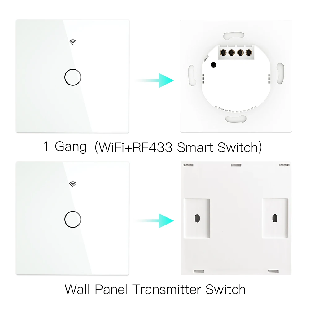 Переключатель WiFi RF433 (главный переключатель):Умный переключатель WiFi RF433, который обладает всеми умными функциями для интеллектуального управления освещением. Таким образом, это главный переключатель для подключенных устройств, а также приемник для настенного панельного переключателя из-за функции RF433.