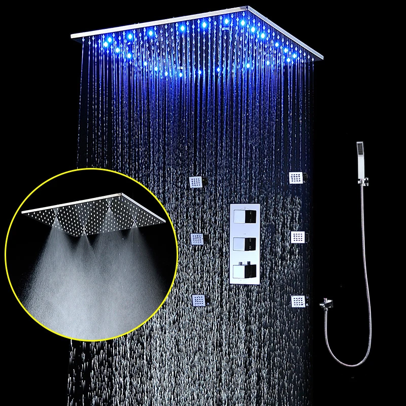 Современный потолочный светодиодный смеситель для душа, набор термостатических смесителей для ванной комнаты, 20 дюймов, распылитель, насадка для душа, массажная насадка для тела