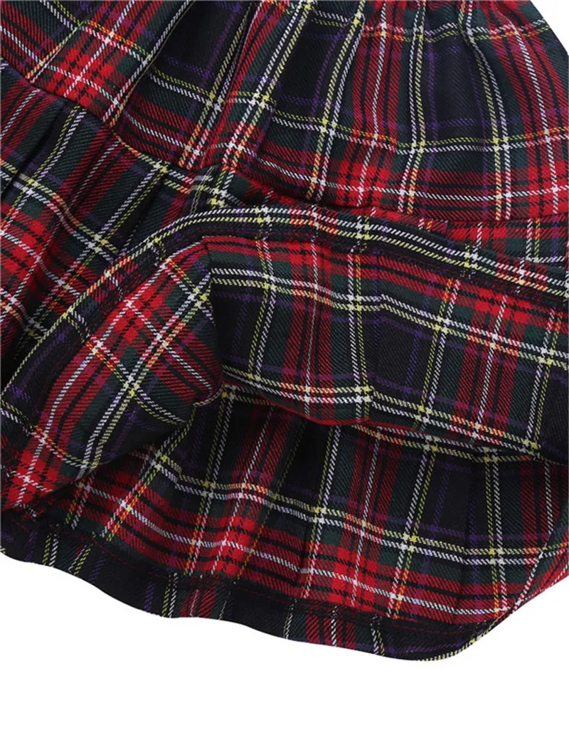 Белая рубашка с отложным воротником, застежка на пуговицах спереди и манжеты. Сочетающаяся с галстуком, плиссированная юбка с эластичным поясом и клетчатым узором.