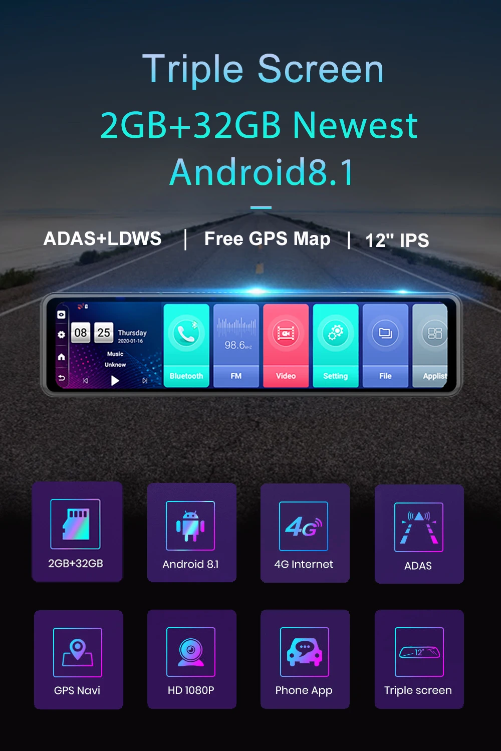 ADAS Plus (LDWS/FCWS/FVMA) + gps-навигация + 4G SIM WIFI + удаленный монитор в приложении для владельца автомобиля + Запись Full HD 1080 P + полный экран 12