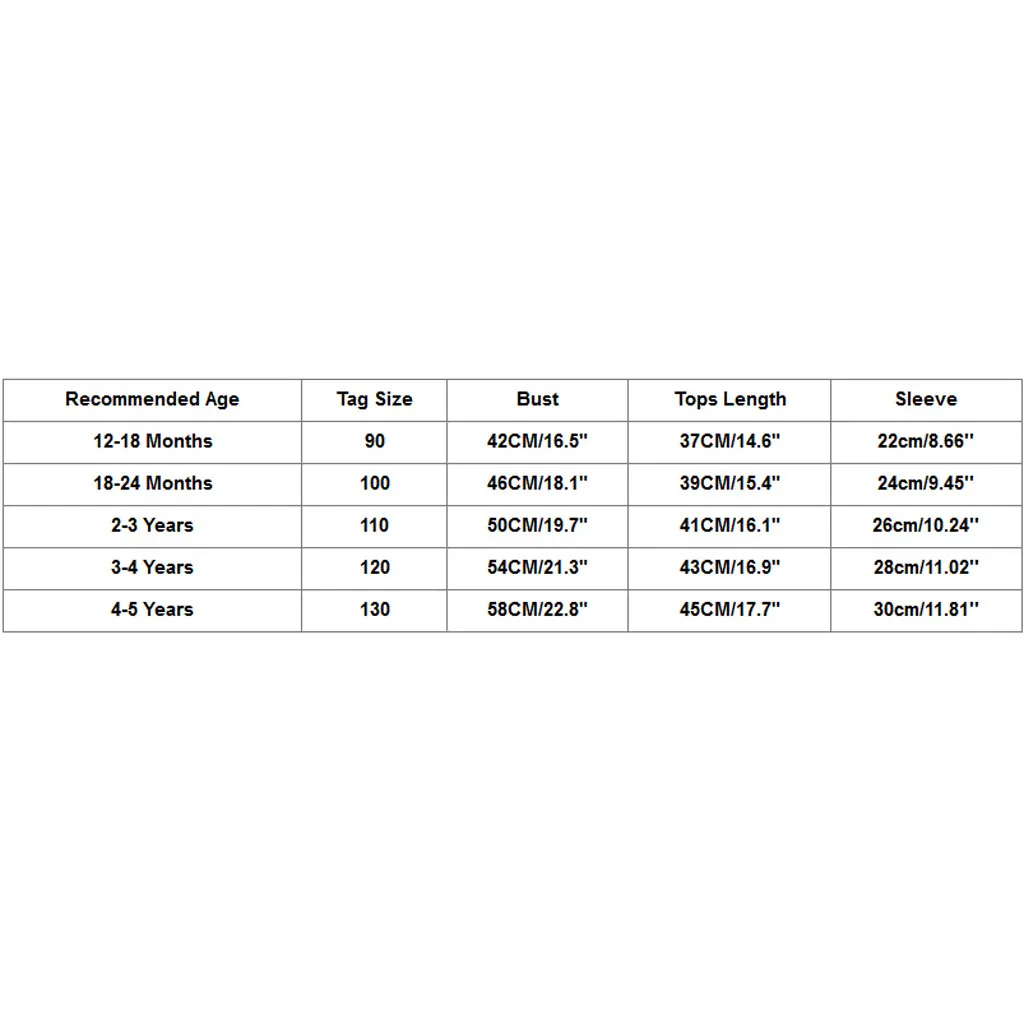 Рекомендуемый возраст Размер бирки Бюст Длина топа Рукав 12-18 месяцев 90 42 см/16,5" 37 см/14,6" 22 см/8,66'' 18-24 месяцев 100 46 см/18,1" 39 см/15,4 дюйма 24 см/9,45'' От 2 до 3 лет 110 50 см/19,7" 41 см/16,1" 26 см/10,24'' От 3 до 4 лет 120 54 см/21,3" 43 см/16,9" 28 см/11,02'' От 4 до 5 лет 130 58 см/22,8" 45 см/17,7" 30 см/11,81''