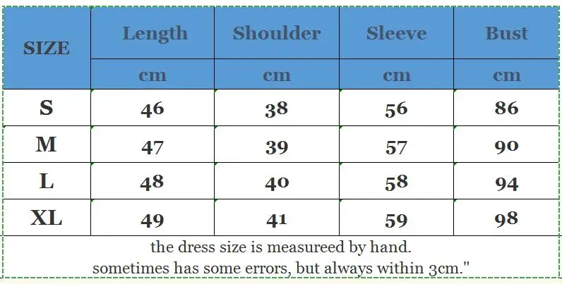 Размер Длина; Ширина плеч; Длина рукава; Объем груди; См см S 46 38 56 86 M, 47 (Европа) 39 57 90 L 48 40 58 94 XL 49 41 59 98 "Размер пришедшего платья окажется является measureed вручную. Иногда есть некоторые ошибки, но всегда в пределах 3 см."