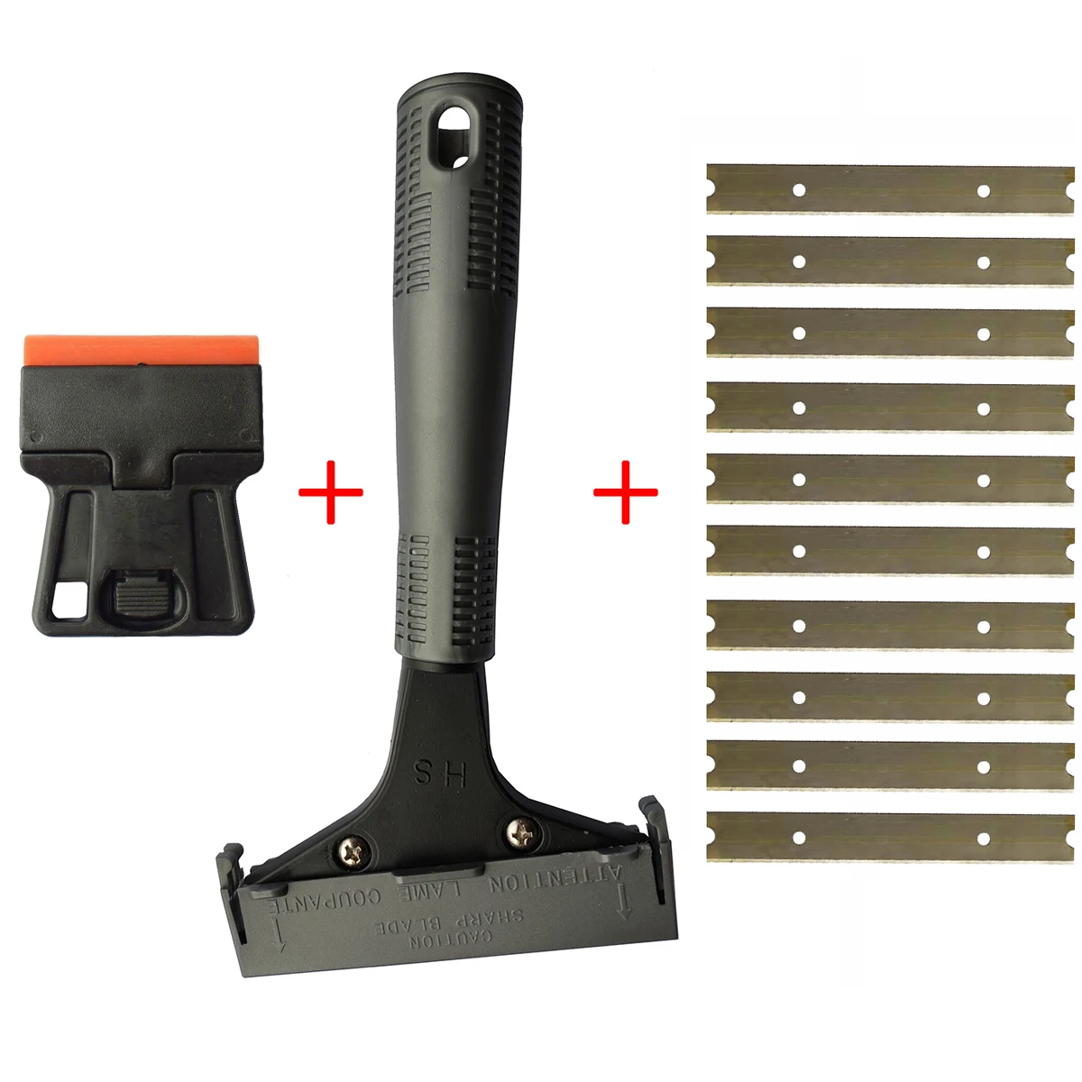 В комплекте: 1 шт., мини-пластиковый скребок для бритвы, 1 шт., стальной скребок для пола, 10 шт., запасные лезвия для скребка для пола