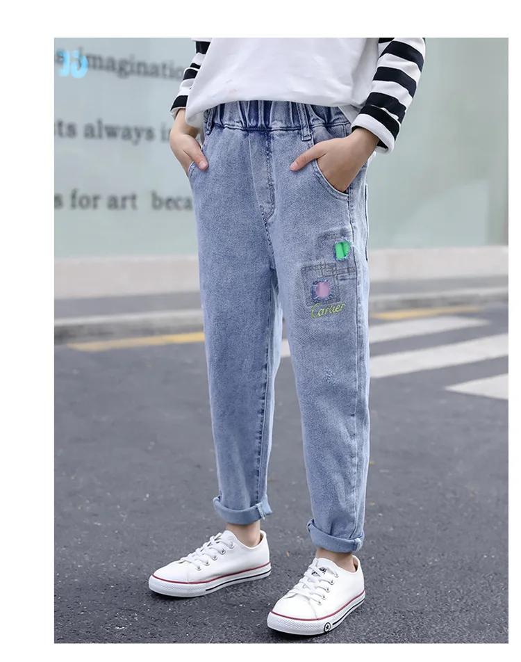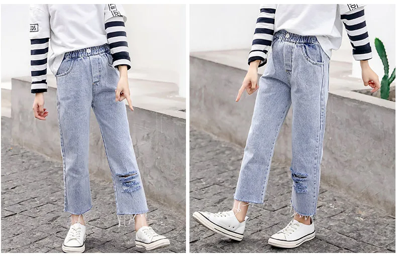 1 модные весенние джинсы для девочек; Джинсовые брюки; Одежда 2 новых 2020 детей сломанные отверстие Жан брюки одежда 3 Детские, средней наивысшего качества с эластичной резинкой на талии, джинсовые штаны