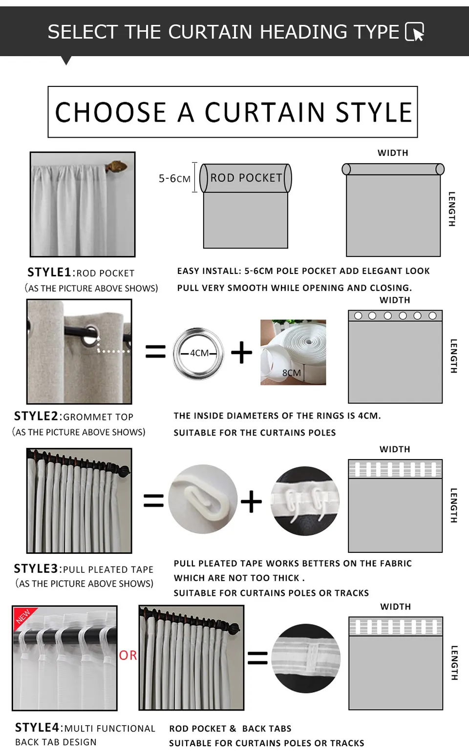 2. Длина штор = B/C (до высоты от полюса/дорожки до нижней части B/C ). E. g. A = 200 см, C = 250 см, размер штор должен быть 2x200x250 см или 2x150x250см.