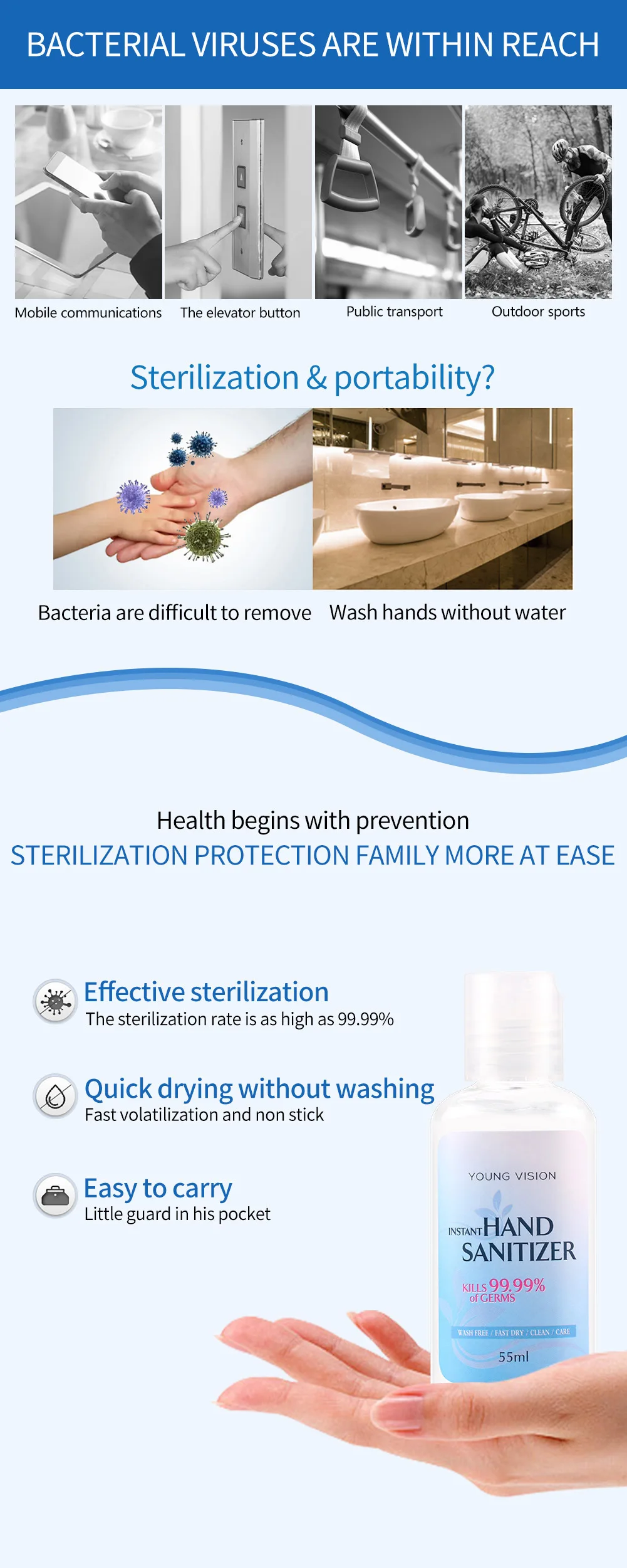Объем: 55 мл Размеры одной бутылочки: 4,2*3,2*9,2 см Производственные Композиции: этанол, вода, глицерин, пропиленгликоль и т. Д., объем использования: 1. Эффективно убивает 99% бактерий. (Staphylococcus aureus, escherichiacoil,Candida,albicans и т. Д.) 2. Не нужно мыть водой, защищая ваше здоровье в любое время, в любом случае 3. Не липкий после использования. Использование: нанесите соответствующее количество этого продукта на ладонь, протрите обеими руками до высыхания без стирки. Срок годности: 24 месяца Дата производства и срок годности: см. Код распыления Меры предосторожности: 1. Этот продукт предназначен для внешнего использования, не принимается в устной форме, Избегайте контакта с глазами и держите подальше от детей. 2. Воспламеняющийся, пожалуйста, держите подальше от источника огня, не теряйте к источнику огня, прежде чем не испаряется полностью при использовании. 3.1f есть раздражение кожи, пожалуйста, прекратите использование, если дальнейшее раздражение, пожалуйста, обратитесь к врачу и держите его ниже 4. Используйте с осторожностью при аллергии на алкоголь. Емкость продукта: 55 мл