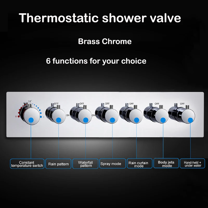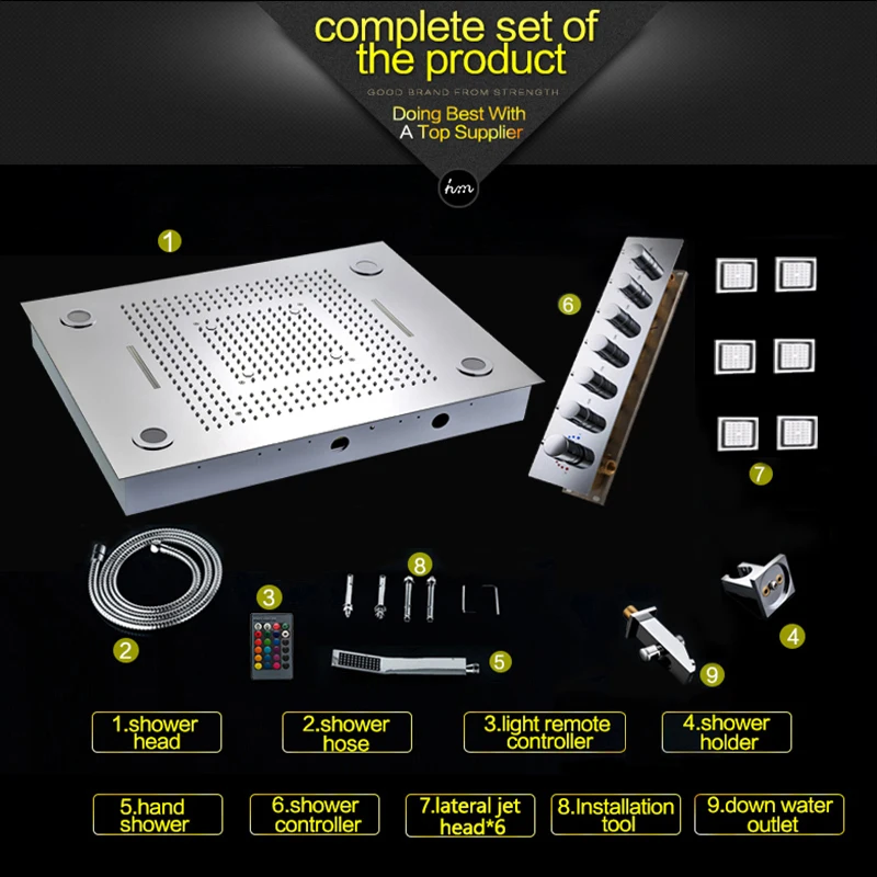 1. Размер душевой головки: 800*600 мм 2. Материал: нержавеющая сталь 304 для душевой головки и душевого шланга, латунь для других. 3. Нить продукта: G1/2 "и G3/4" 4. Функции: дождевые осадки, водопад, занавески для дождя, спа-туман, струи для душа, ручной душ, водный носик. 5. Светодиодный: многоцветный, изменен пультом дистанционного управления 6. Клапан: 6 + 1 термостатический клапан с высоким потоком