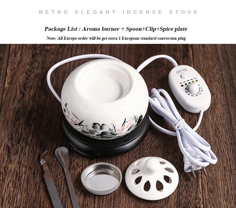 100% новый и высокое качество Материал: Керамика Характеристики: питание может быть отключено регулярно, и температура может быть скорректирована. Избегайте сухого горения во время использования. Напряжение: 220-240 В Применимое место: медитация, йога ароматерапия, СПА Ароматерапия, спальня ароматерапия, домашний декор дезодорирование Название: эфирные масла Арома горелки