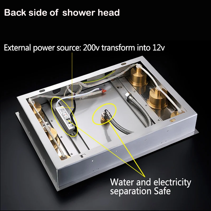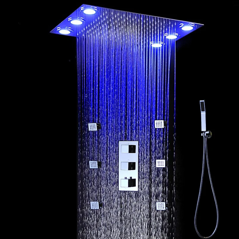 1. Размер насадки для душа: 360*500 мм 2. Материал насадки для душа: нержавеющая сталь 304 3. Материал смесительного клапана: латунь 4. Отделка: хром 5. Функции: дождь, струи тела и ручной душ 6 .. смеситель для душа: 3 способа Термостатический смеситель для душа. 7. Показать размер струй тела: 2 дюйма 8. Светодиодный душ имеет много цветов. Цвет изменяется удаленным контроллером.