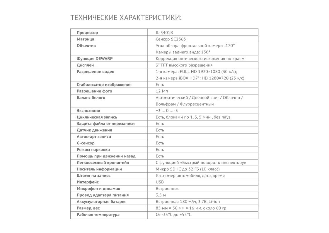 The device has the ability to connect the rear view camera iboxrearcamhd7. At the same time, simultaneous recording from two cameras is carried out together with the function "assistance when moving back". When driving the car back on the display, the device automatically turns on the video from the rear camera.