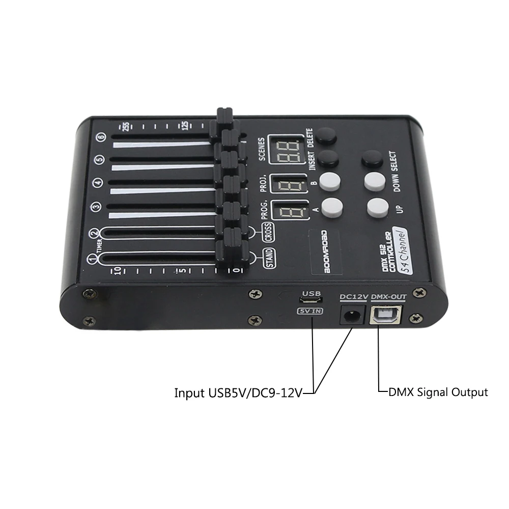 * Вы можете использовать свой мобильный телефон зарядное устройство для питания консоли через USB 5V в порт на стороне контроллера. * Может управлять до 9 смарт-ламп по 6 каналов каждый, в общей сложности 54 канала * 6 фейдеров спереди для прямого контроля * Входы и выходы DMX в 3 pin XLR