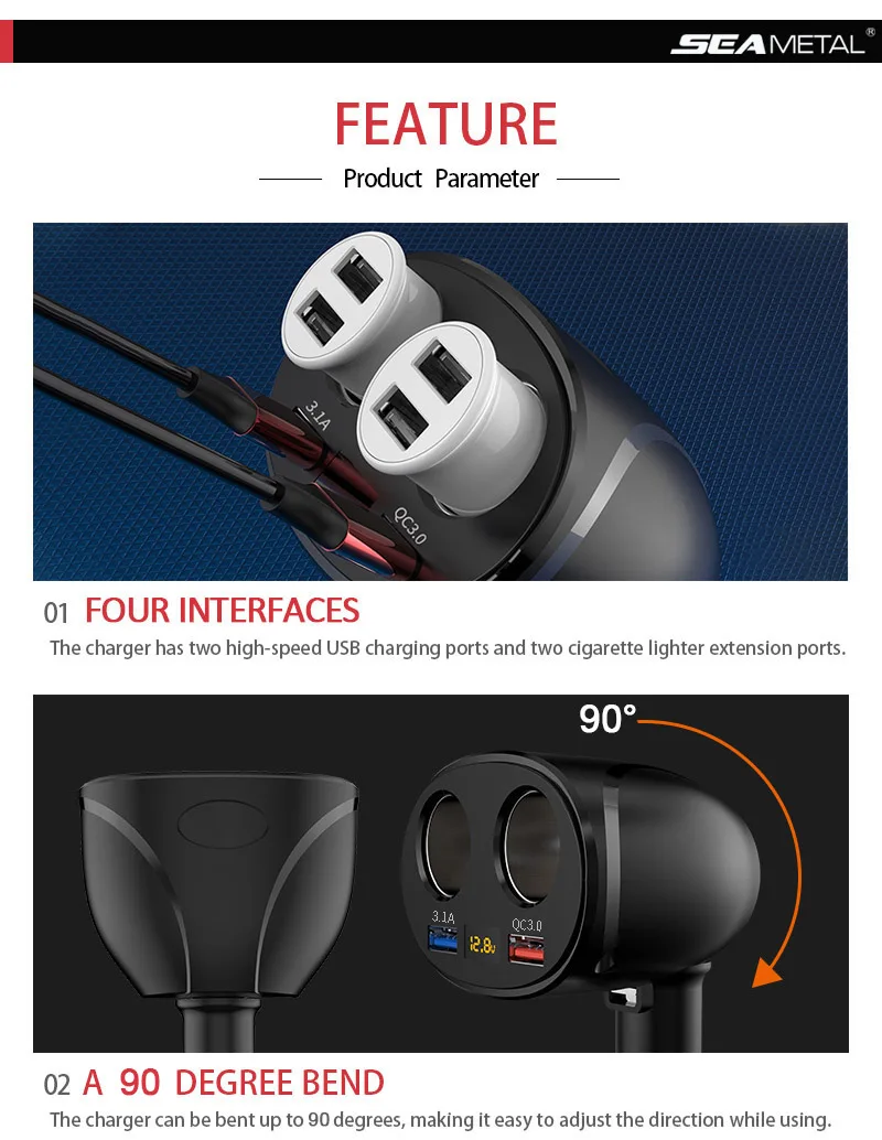 1. Два отверстия для прикуривателя; Два usb-порта, один 3,1 А, один QC зарядка;