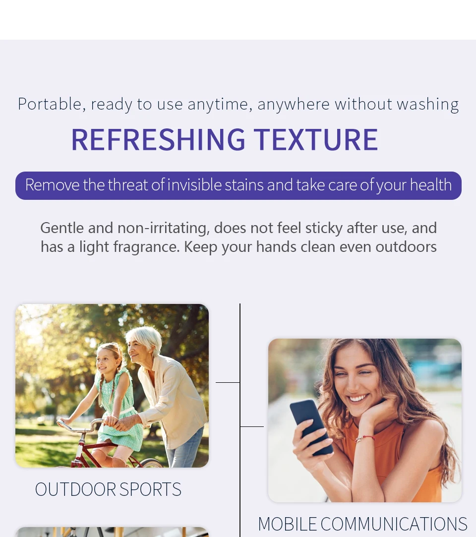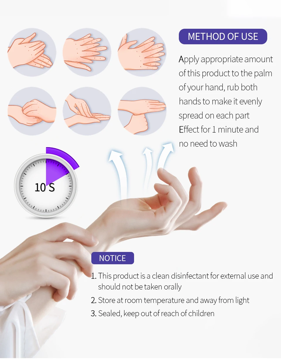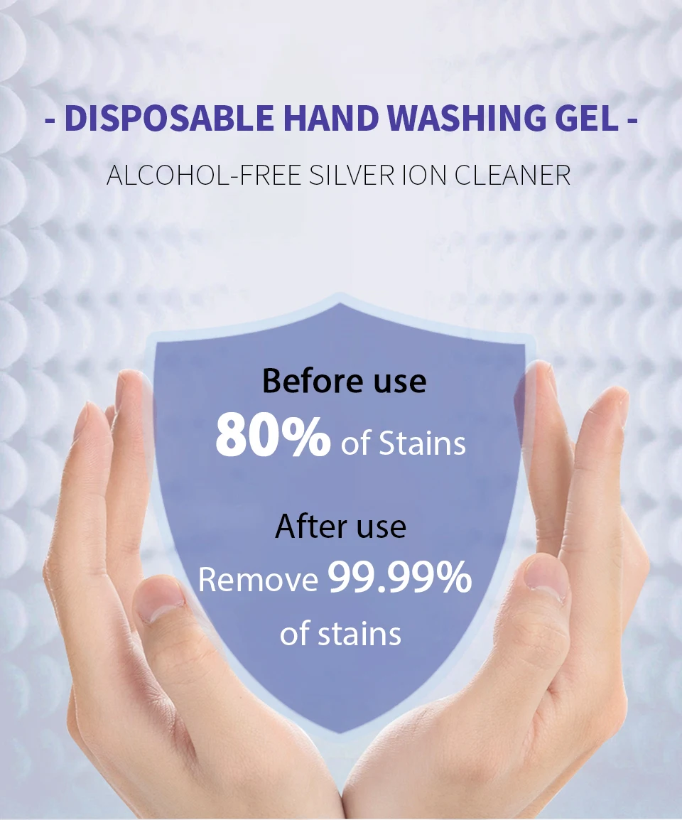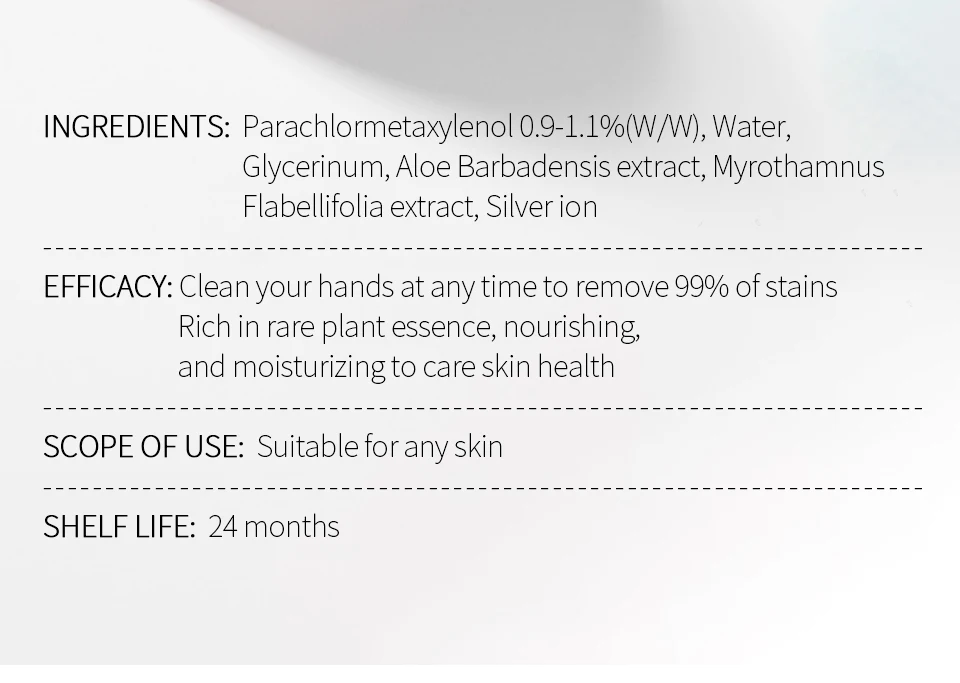 🌟[Ингредиенты]: Parachlormetaxylenol 0,9-1.1% (В/Ш), вода, глицерин, экстракт алоэ барбаденсис, Myrothamnus, экстракт флабеллифолии, ион серебра 🌟[Эффективность]: Очистите руки в любое время, чтобы удалить 99% пятен, богатых редкой растительной эссенцией, питательный, И увлажнение для ухода за здоровьем кожи 🌸Особенности 1. Портативный, готов к использованию в любое время, в любом месте без стирки 2. Заботьтесь о своем здоровье 3. Мягкий и не раздражающий, не ощущается липким после использования и имеет легкий аромат 4. Держите руки в чистоте даже на открытом воздухе