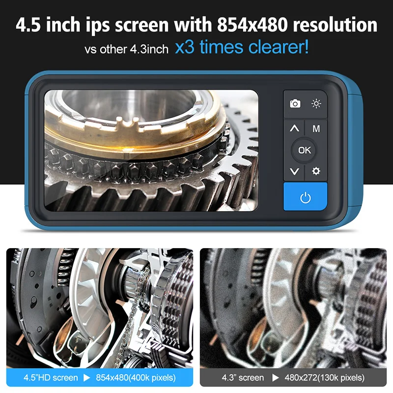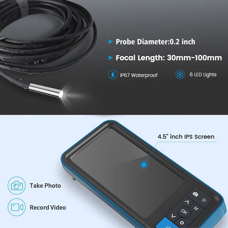 1. 【 Диаметр 5,5 мм 】: маленький Маленький Наконечник диаметром 5,5 мм (0,21 дюйма), С широким полем зрения, позволяет легко получить доступ к большинству приложений, таких как трубы сабо, осмотр стены, обслуживание автомобильной и бытовой техники, ОВКВ, самолета или автомобиля проверки двигателя, осаждение углерода, Проверка цилиндра и т. д. лучший Диапазон фокусировки: 3-10 см (1,2-3,9 дюйма) 2.【 разрешение 1080P: миниатюрная камера с высоким разрешением, 1,0 мегапикселей, обеспечивает четкое и четкое полноэкранное изображение. Примечание: перед первым использованием зарядите бороскоп в течение 2-3 часов. 3.【 приложение-Бесплатная работа и обновленный 5 ''IPS экран 】: с обновлением 5'' Full-View IPS экран, больше нет необходимости использовать приложение и мобильный телефон. Полный продукт, другие беспроводные Эндоскопы все еще должны работать с мобильным телефоном. Доступно с полужестким кабелем длиной 5 метров. 4.【Multifunctional】: оснащен мощным переменным светодиодным освещением, позволяющим проверять в темных местах, IP67 водонепроницаемый и устойчивый к коррозии. Так легко фотографировать, записывать видео, 2500 мАч перезаряжаемый литий-ионный аккумулятор в течение 3-4 часов с использованием времени.
