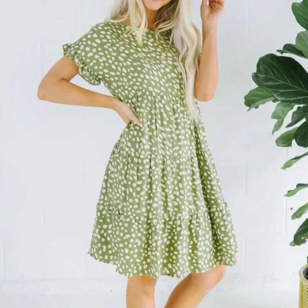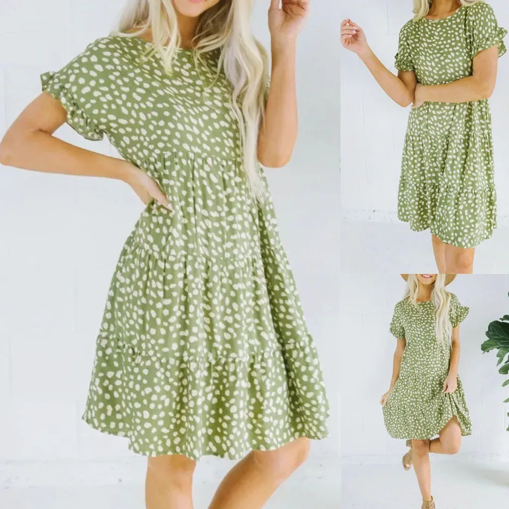 Женское мини-платье с круглым вырезом, коротким рукавом и волнистым принтом
