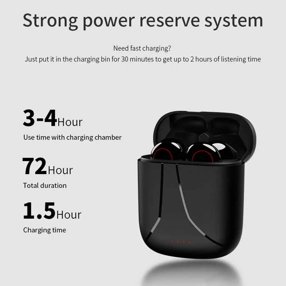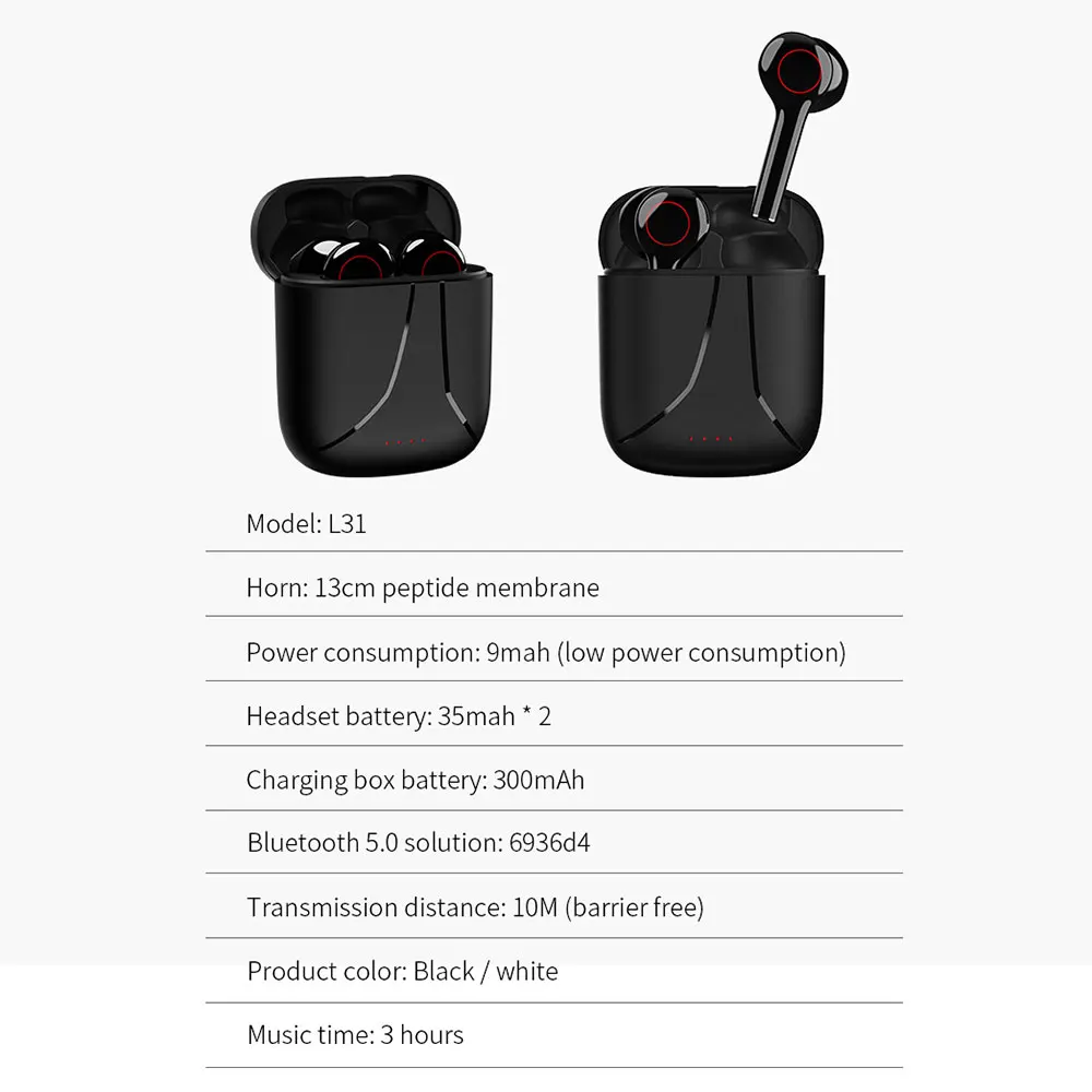 Версия Bluetooth: 5,0 Материал: пластик EBS Эффективное линейное расстояние: более 10 метров Динамик: медное кольцо 13 мм Аккумулятор: гарнитура 35 мАч * 2, зарядный отсек 300Ah Время непрерывной работы: 3,5 H Время работы в режиме ожидания: 100 Ч Полностью заряженный время: 0,5 H Цвет: черный, белый