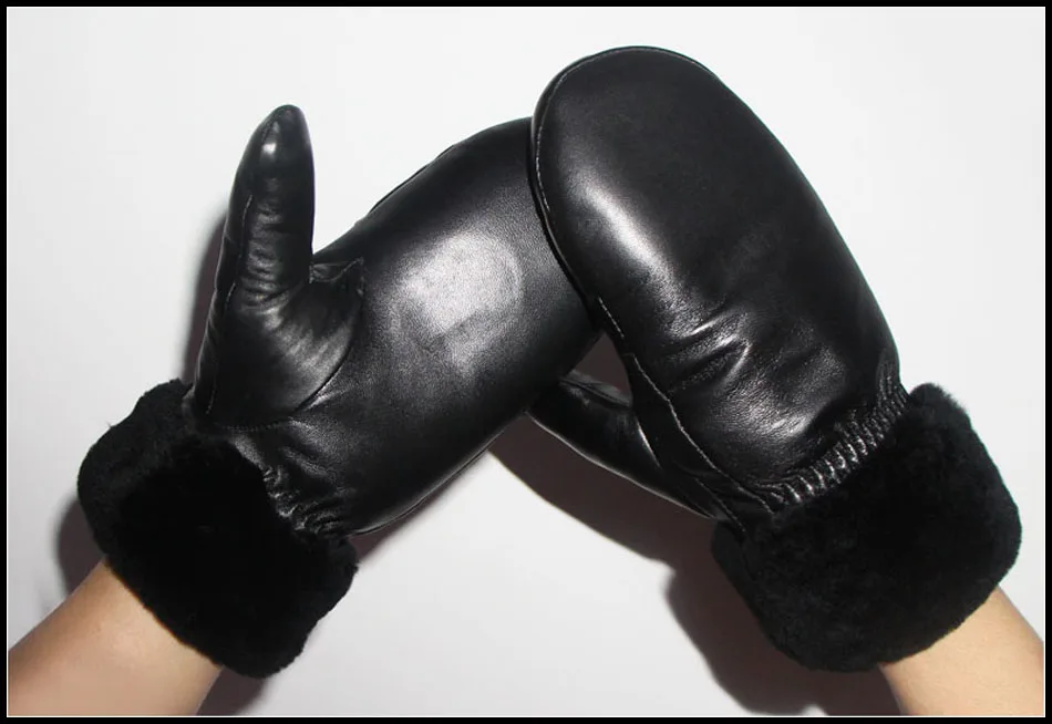Men's leather genuine wool mittens --- sheepskin black wool mittens : SJN1