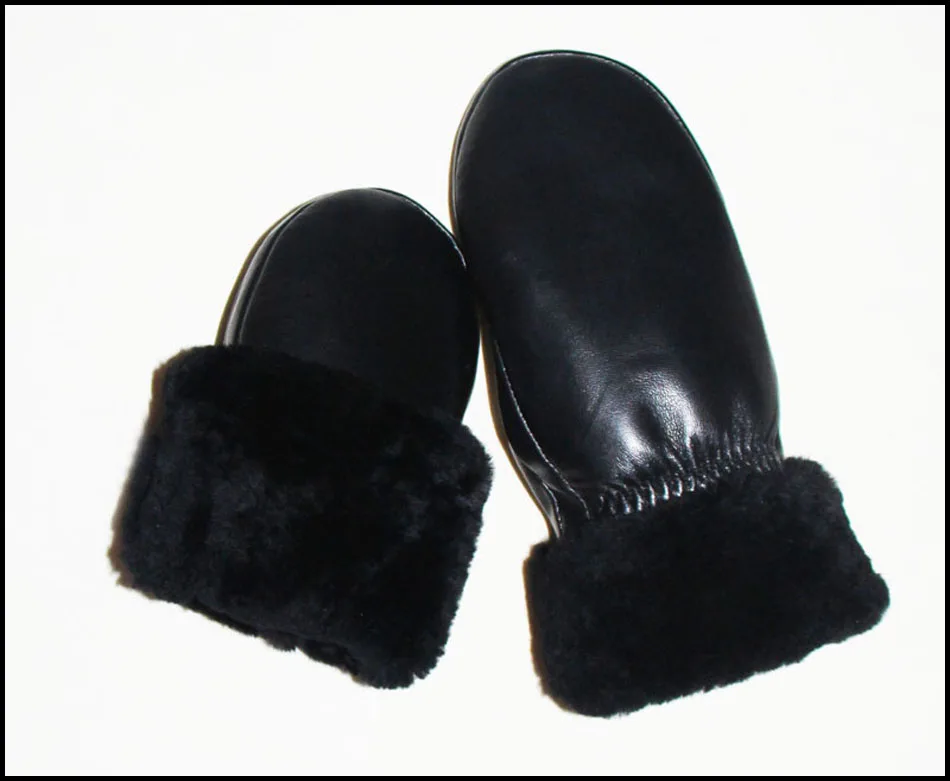 Female leather genuine wool mittens --- sheepskin black wool mittens: SNN1