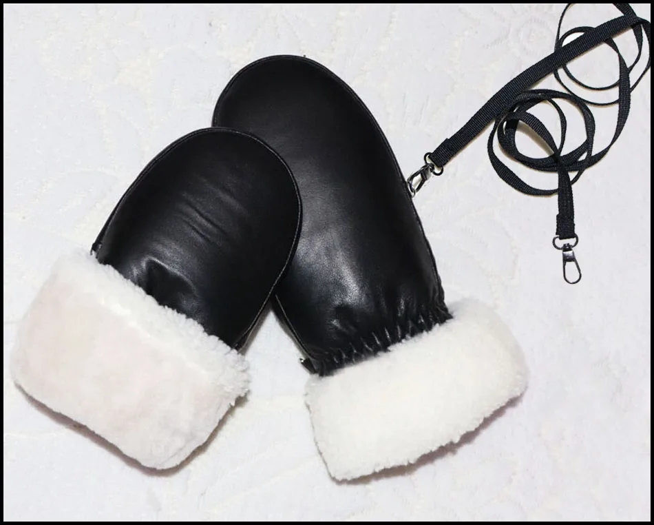 Female version [with lanyard] genuine leather wool mittens --- sheepskin black wool mittens: SNN2