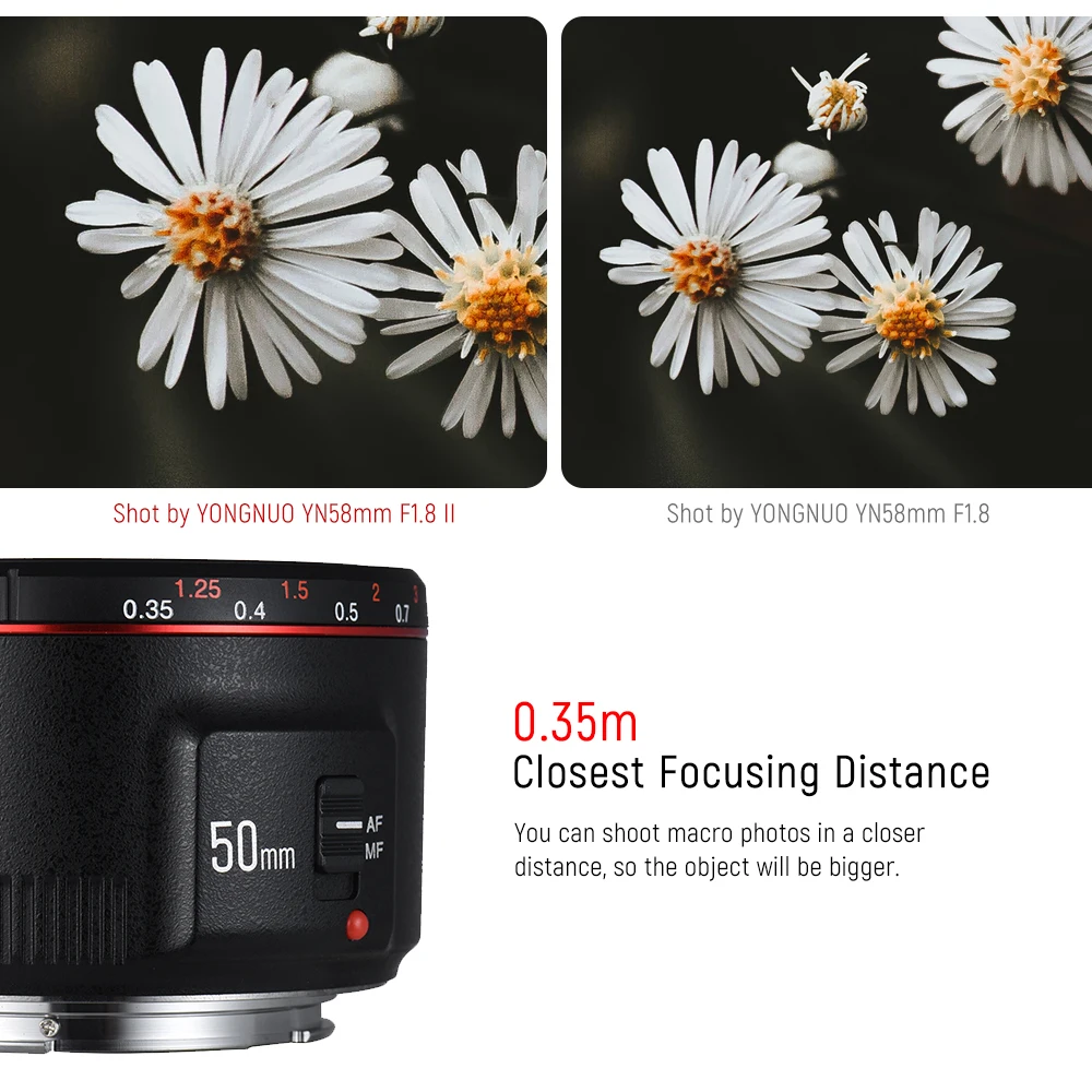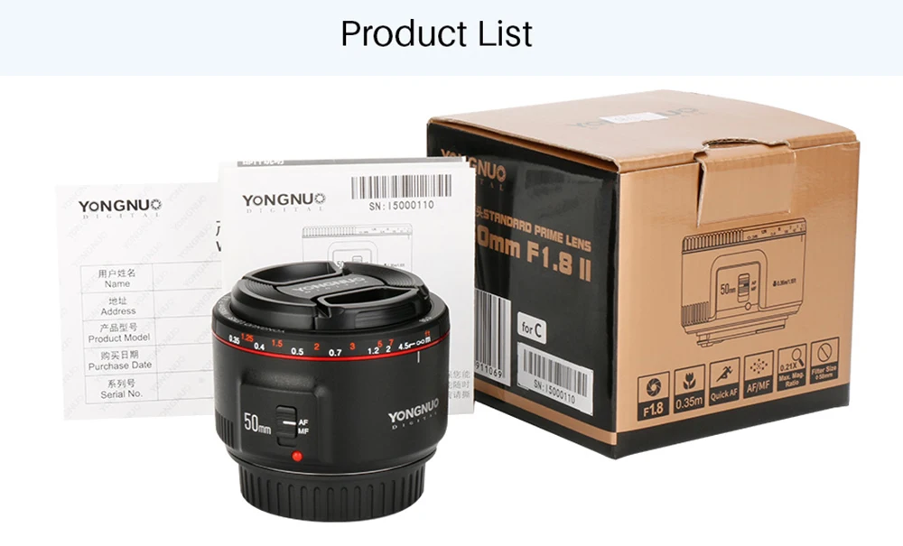 YN50mm F1.8 II: YN50mm F1.8 II имеет все преимущества продукта последнего поколения. Более того, он также оснащен 0,35 М ближайшим расстоянием фокусировки, прочным металлическим креплением и обновлением прошивки без USB. Особенности: F1.8 яркая апертура-эффект боке может быть достигнут легко, принося вам больше удовольствия во время фотографии. 7 шт. диафрагма лезвия-помогать вам сфотографировать круговой defocused пятен или 14-звезды эффект. Поддержка автоматического и ручного фокуса-отвечает различным практическим требованиям. Со встроенным индикатором расстояния фокусировки. 0,35 М расстояние фокусировки-так что вы можете приблизиться к объекту для фотографии и получить больше изображения. Прочное металлическое Крепление-это износостойкое, коррозионно-стойкое и хорошо Совместимо с корпусом камеры. Новая механическая структура и технология нанесения покрытия-эффективно повышает точность фокусировки, скорость автофокуса и коэффициент пропускания на светильник, а также защищает задний светильник от привидения и бликов. Обновление прошивки без USB-Обновление с конца камеры. Это не только отвечает требованиям обновления прошивки и дизайна внешнего вида, но также позволяет избежать проблем несовместимости, вызванных различными компьютерными операционными системами. (Примечание: Эта функция должна поддерживаться камерой.) Технические характеристики: Бренд: Светодиодная лампа для видеосъемки YONGNUO Цвет: черный/белый (опционально) Модель: YN50mm F1.8 II Фокусное расстояние: 50 мм Угол обзора: 46 ° (диагональ), 27 ° (по вертикали), 40 ° (по горизонтали) Конструкция линз: 5 групп 6 элементов Лезвие диафрагмы: 7 шт. Минимальная диафрагма: f/22 Мин. Расстояние фокусировки: прибл. 0,35 М Макс. Увеличение: прибл. 0,21 раз Система вождения: двигатель прямого тока: Диаметр фильтра: 58 мм Макс. Диаметр и длина: прибл. 75 75*51 мм Вес изделия: 190 г/6,7 унций (с чехлами) Посылка Размеры: 10,5*10,5*9,8 см/4,1*4,1*3,8 дюймов Вес посылка: 290 г/10,2 унций Посылка список: 1 * YN50mm F1.8 II объектив с чехлами 1 * Руководство пользователя (английский/китайский) 1 * салфетка для чистки Zomei (бесплатный подарок)