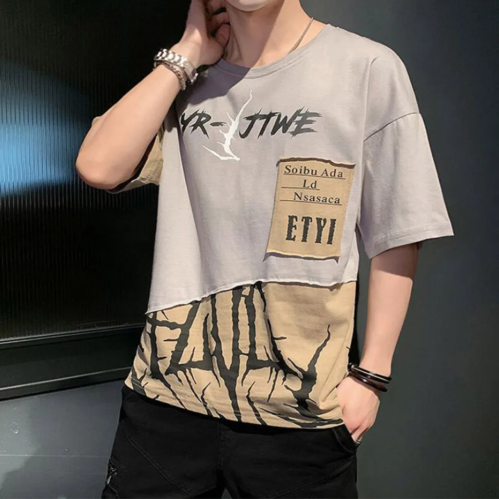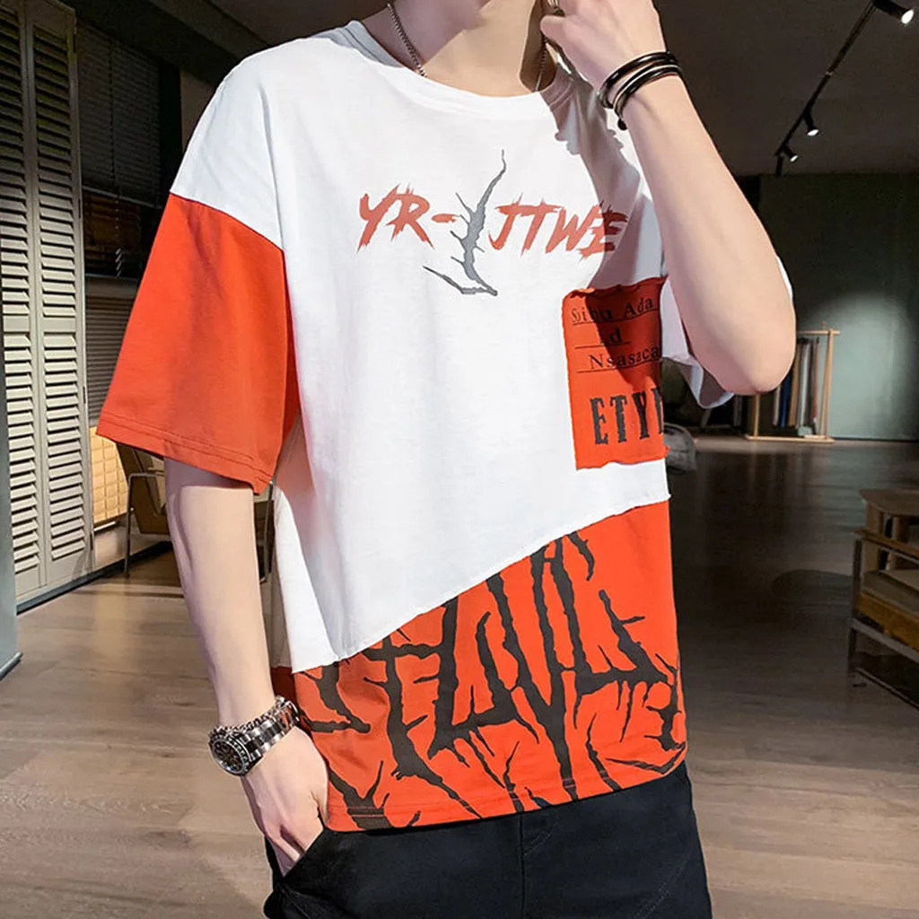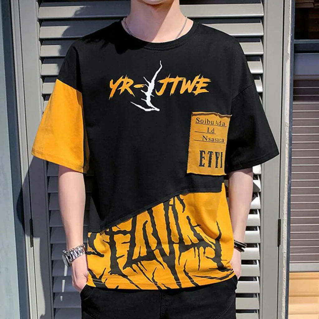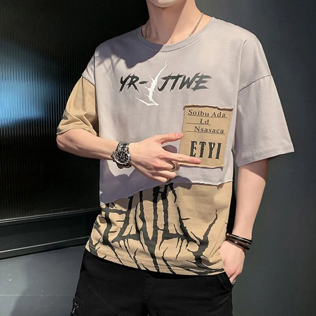 1. Особенности: модные мужские топы, СращиваниеФутболка с короткими рукавами и принтом.2. Материал: полиэстер. ПолиэстерВолокна, изготовленные из высококачественной ткани, мягкие и удобные. Прозрачная, Воздушная и легкая, удобная. Ткань растягивается.