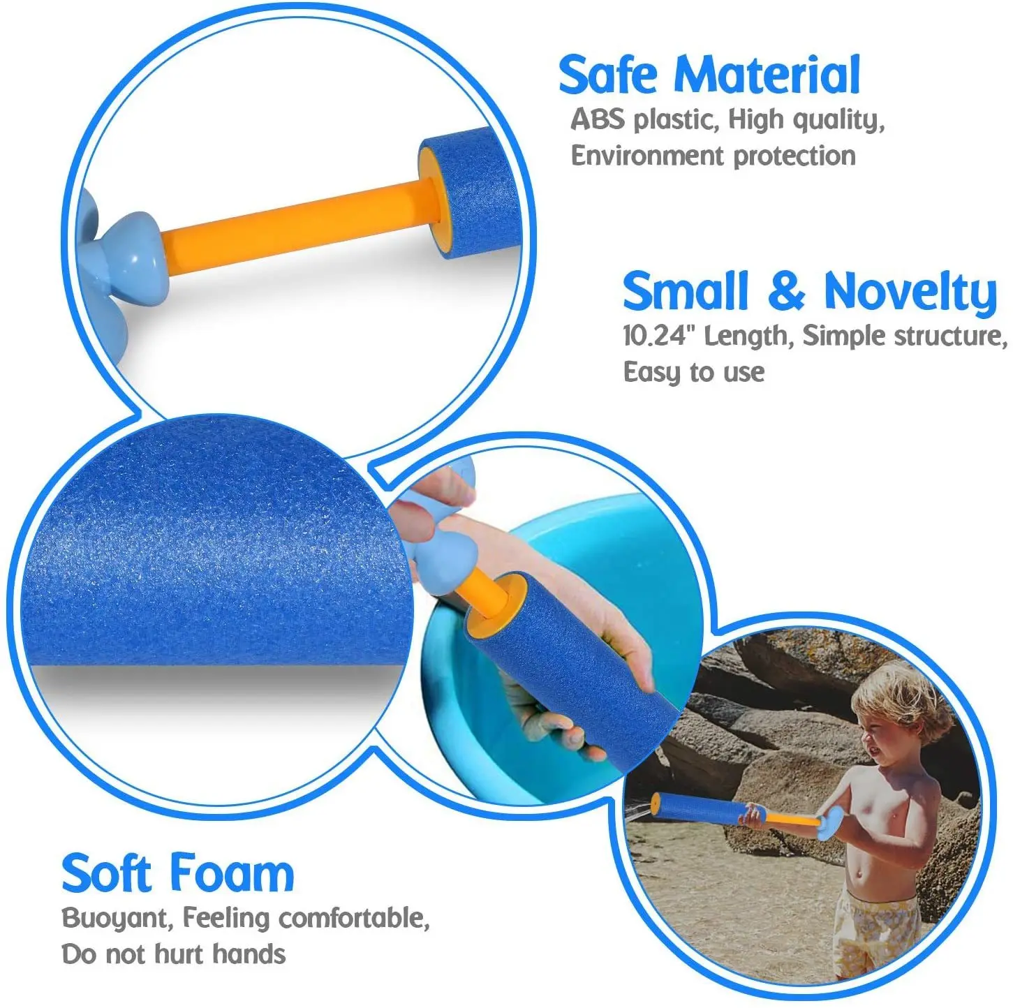 Just dip the nozzle into water, pull the handle to fill the most water into the foam water gun. Push forward, it can shoot water up to 30 ft.