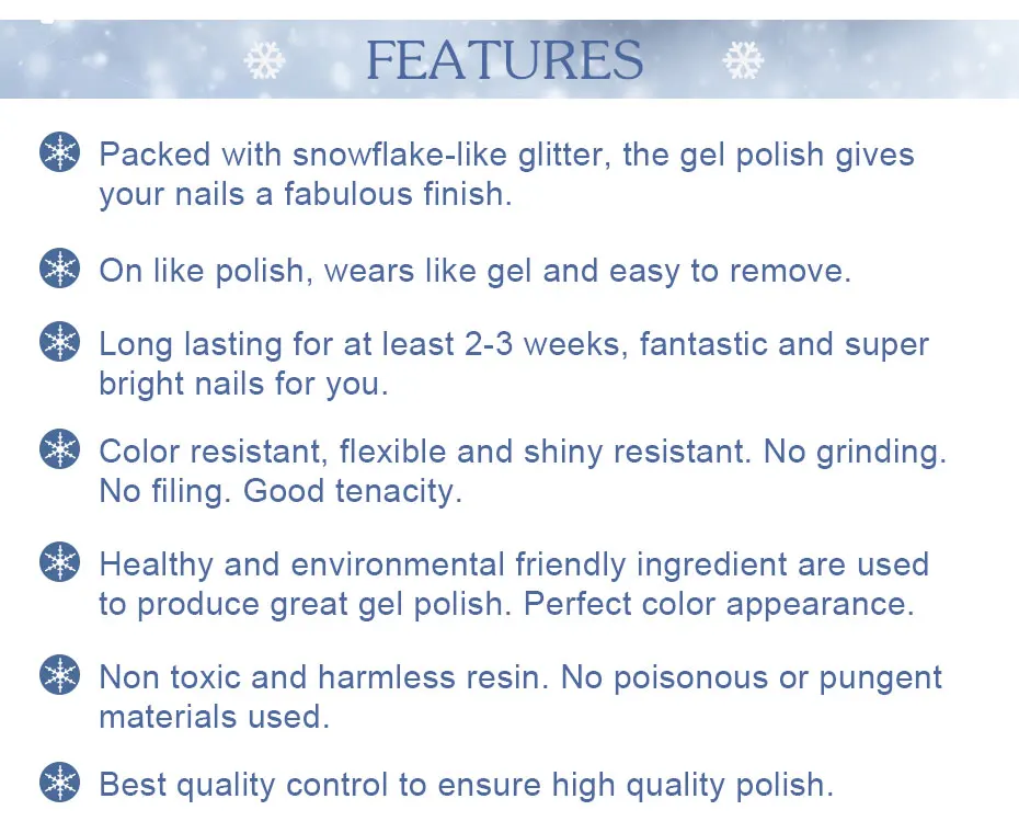 * Длительный срок службы не менее 14 дней, фантастические и супер яркие ногти для вас.