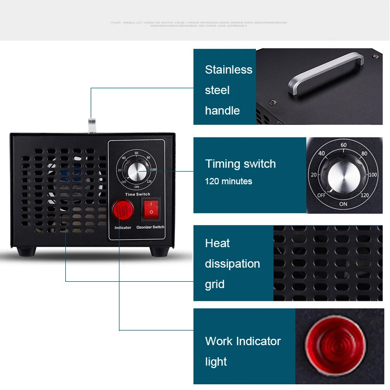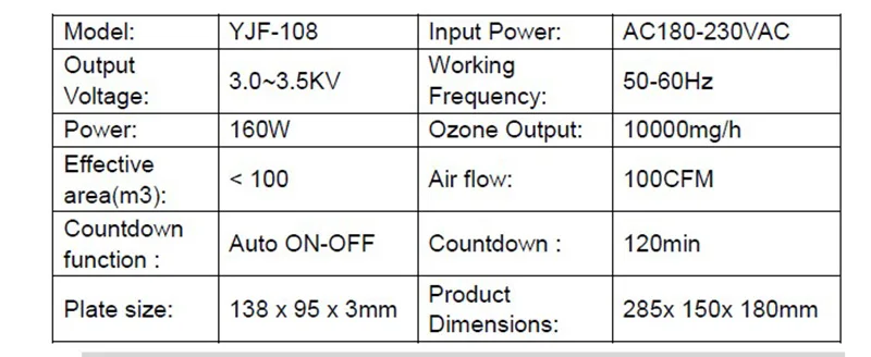 Входная мощность: AC180-230VAC Выходное напряжение: 3,0-3.5KV Рабочая частота: 50-60 Гц Мощность: 160 Вт Ozeon выход: 10000 мг/ч Эффективная площадь (м³):<100 Расход воздуха: 100CFW Функция обратного отсчета: Автоматическое включение Обратный отсчет: 120 мин Размер пластины: 138*95*3 мм Размеры изделия: 285*150*180 мм Штекер: штепсельная вилка европейского стандарта, 220 В, 50 Гц/США, 110 В, 50 Гц