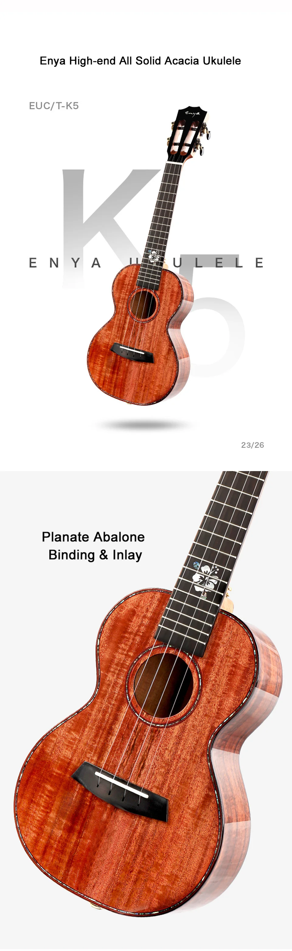 Модель: EUC/T-K5 Размер: концертный 23 "/Tenor 26" Горловина: красное дерево с креплением на шею Корпус: 5А цельная акация Грифовой накладки: радиус Richlite Длина планки между проемами линз: Richlite Тюнер: открытый черный агат Струны: Углеродные струны Enya (23 ") /струны Daddario (26") Отделка: высокий глянец Пикап: двойной A1U (опция)