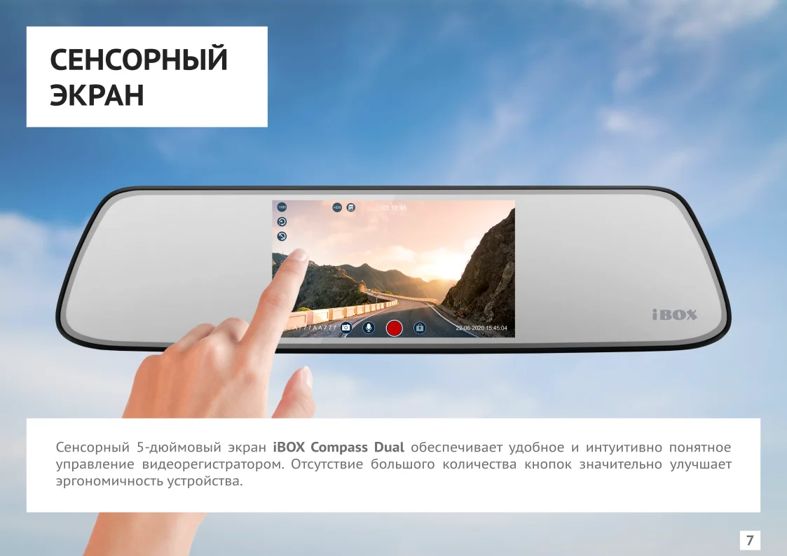 iBOX Compass Dual – двухканальный видеорегистратор-зеркало заднего вида с большим 5-ти дюймовым сенсорным дисплеем и второй камерой с функцией помощи при движении назад.