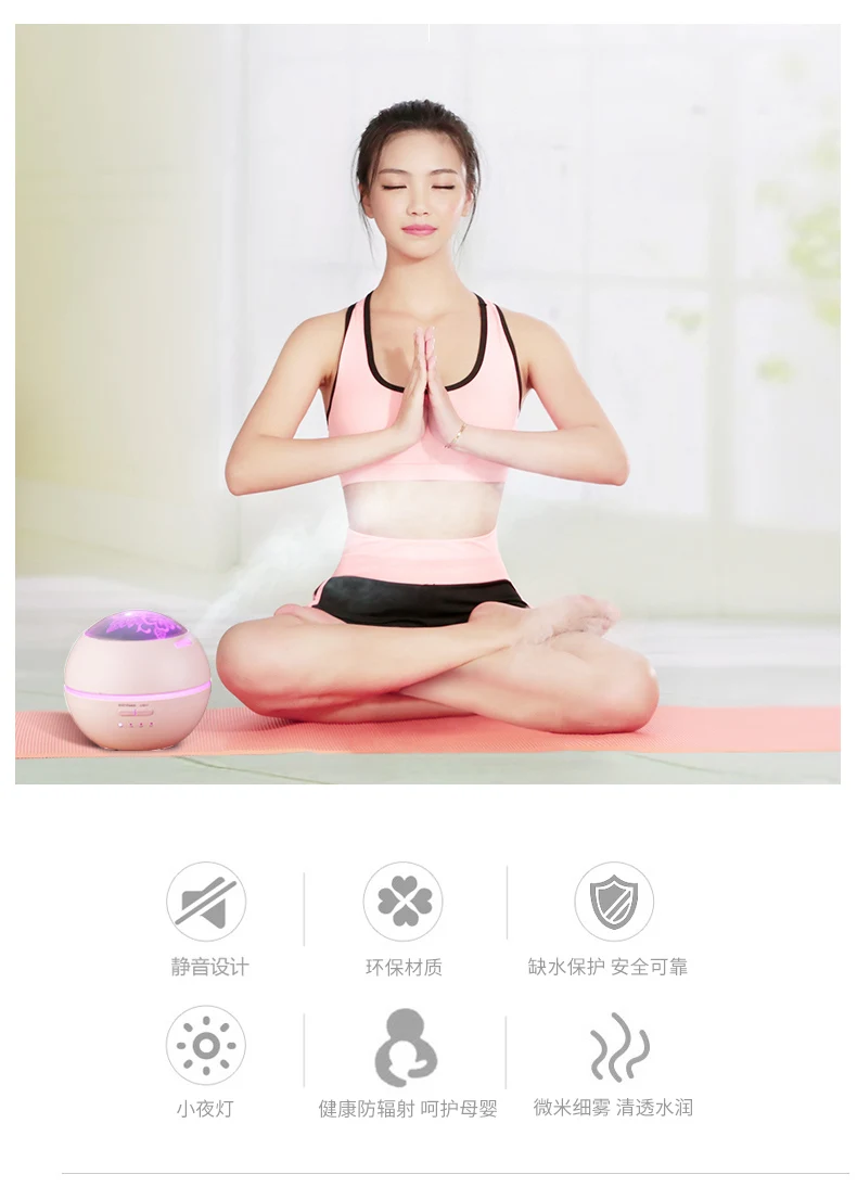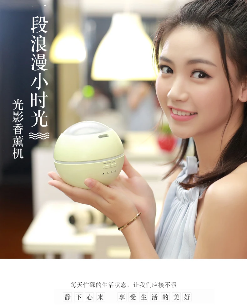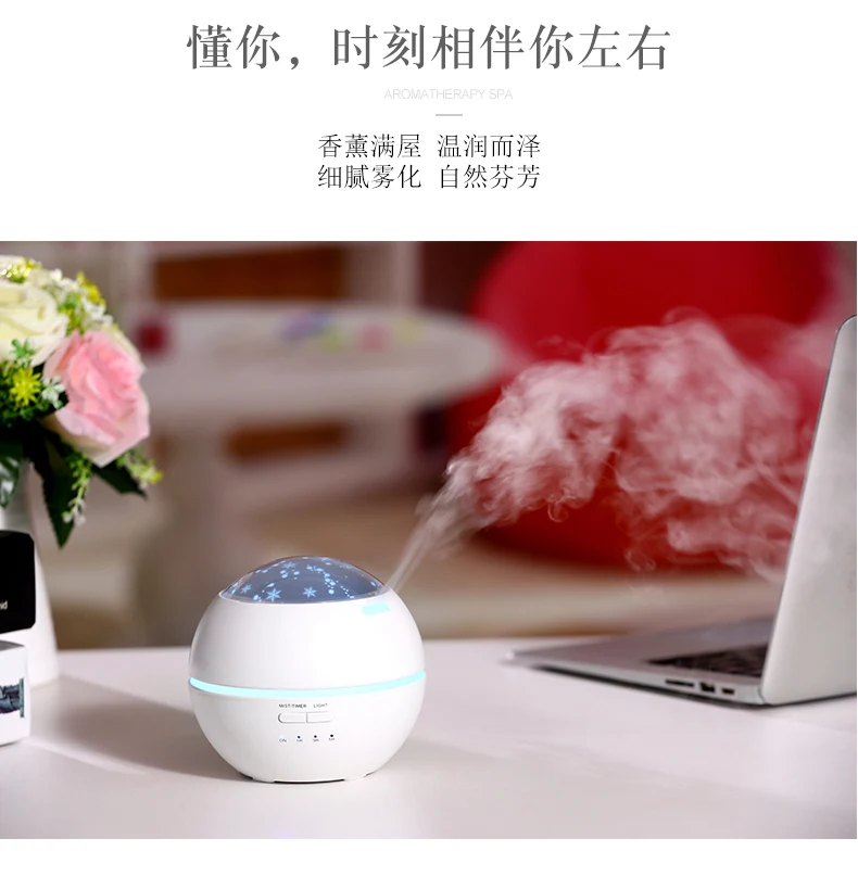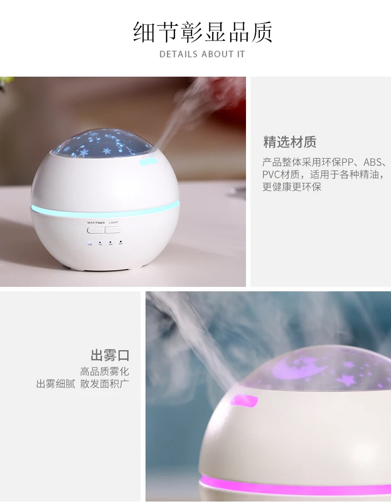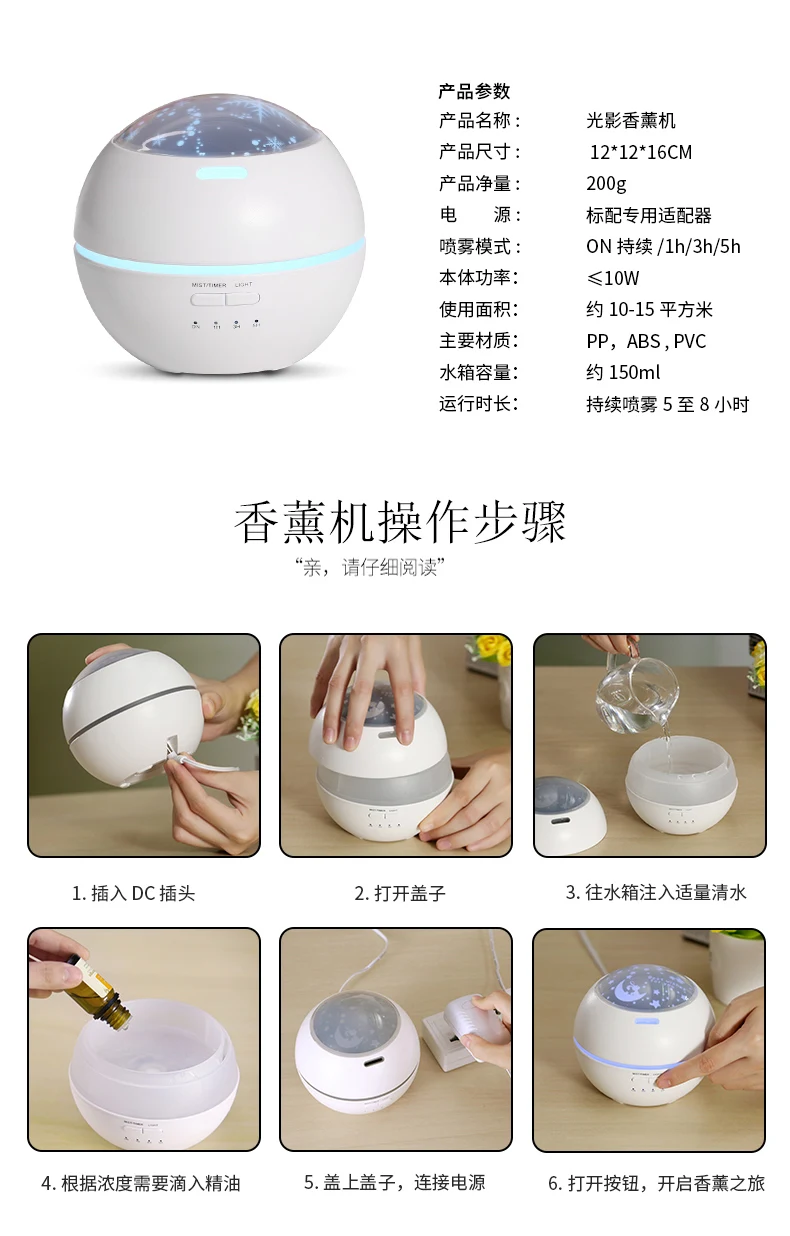 Размер продукта: 120*120*108/4,72 "* 4,72" * 4,25" Вес Включенная Упаковка: 500 г Мощность: 14,5 W Вход и выходное напряжение зарядного устройства: AC100-240V DC24V 0.4A Емкость: 150 мл Характеристики: довольно, ароматерапия, увлажнение, цветной проектор, ночной Светильник Время работы: до 8 часов Материал: ПП + АБС-пластик Ультразвуковая частота: 2,4 МГц Характеристика: 7 цветов освещения. Предотвращение сухого горения. Всего с 4 фильмами для проектора