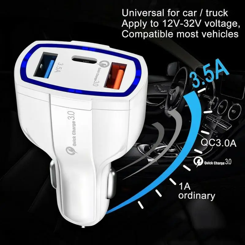 Это 35 Вт сверкающий быстрый автомобиль, внедорожник, зарядное устройство для грузовиков с многофункциональными 3в1 способностями быстрого зарядного устройства 3,0, TYPE C и 3.5A USB портов. Обеспечивает более быструю и стабильную скорость зарядки с широкой совместимостью для всех ваших устройств. Usb-порт Quick Charge 3,0 позволяет заряжать устройства с поддержкой Quick charge 3,0 до 80% в течение примерно 35 минут. И порты TYPE C позволяют заряжать устройства TYPE C и 3.5A позволяют заряжать все usb-устройства.