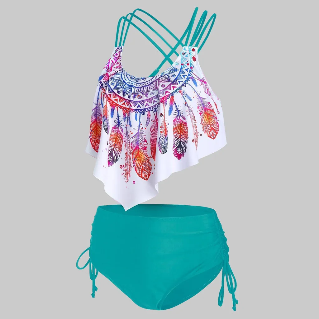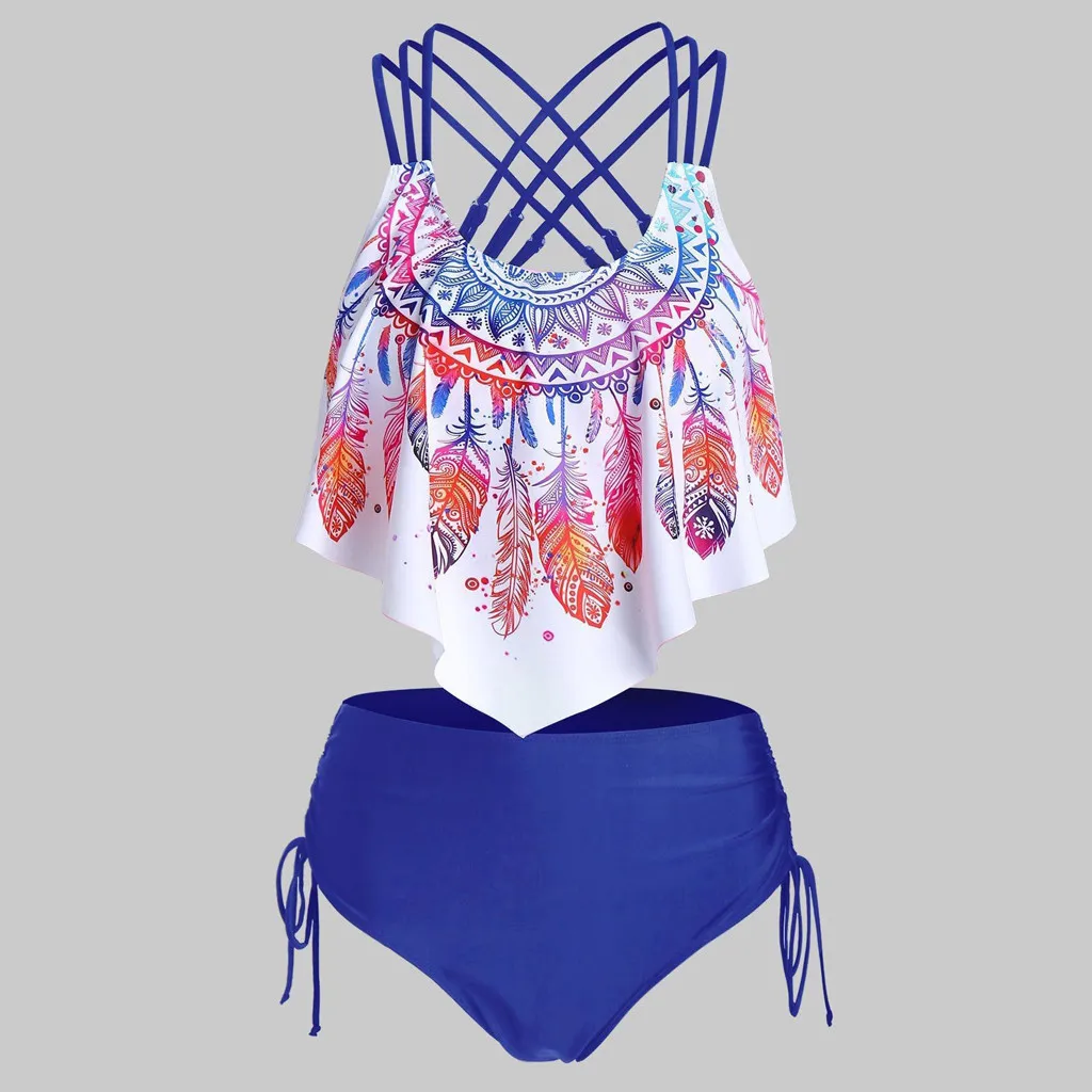 Женский купальник-танкини с принтом перьев пуш-ап с подкладкой и оборками